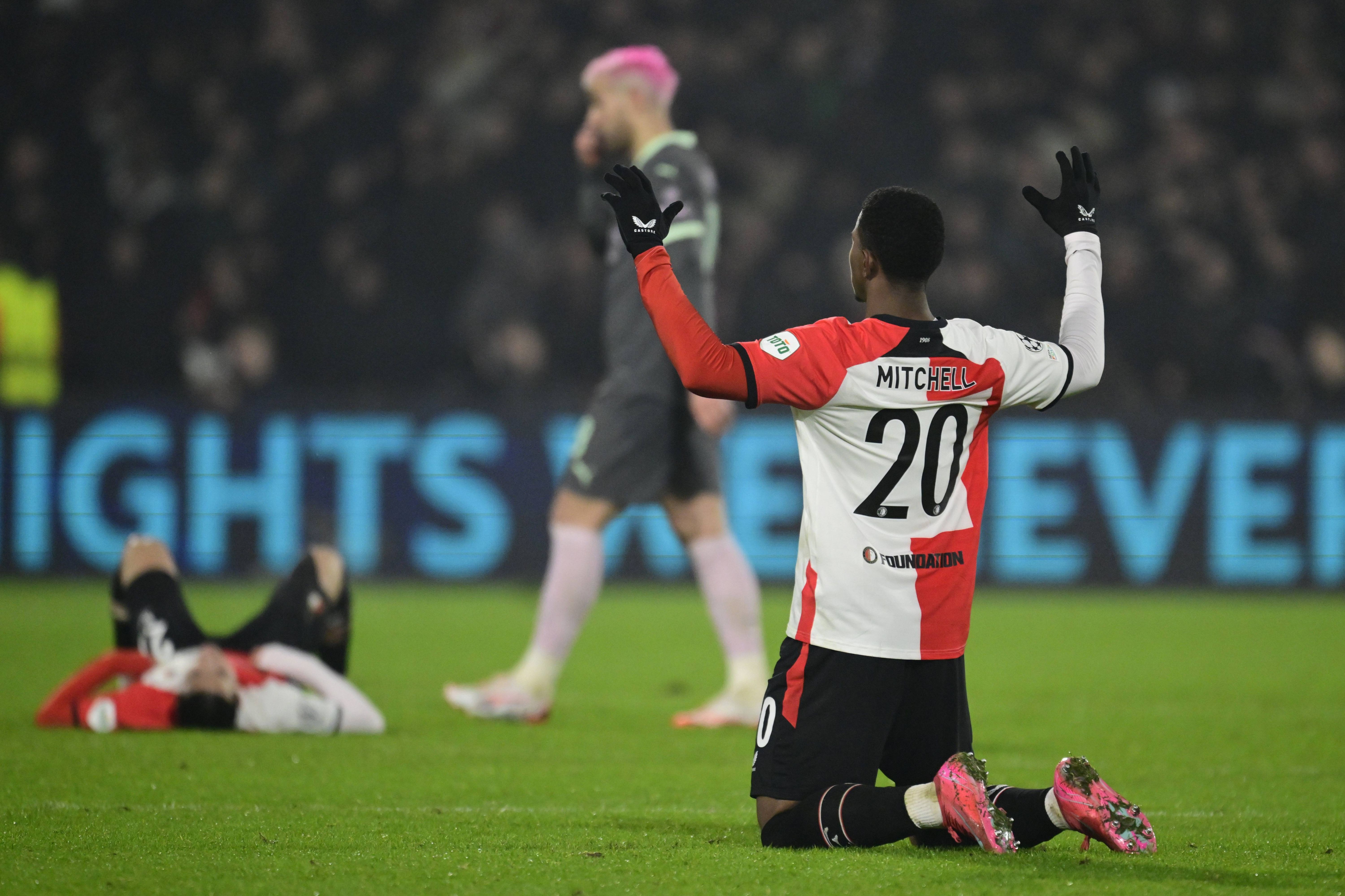 ROTTERDAM - Jeyland Mitchell of Feyenoord celebrates victory during the UEFA Champions League playoff match between Feyenoord and AC Milan at Feyenoord Stadium de Kuip on Feb. 12, 2025 in Rotterdam...