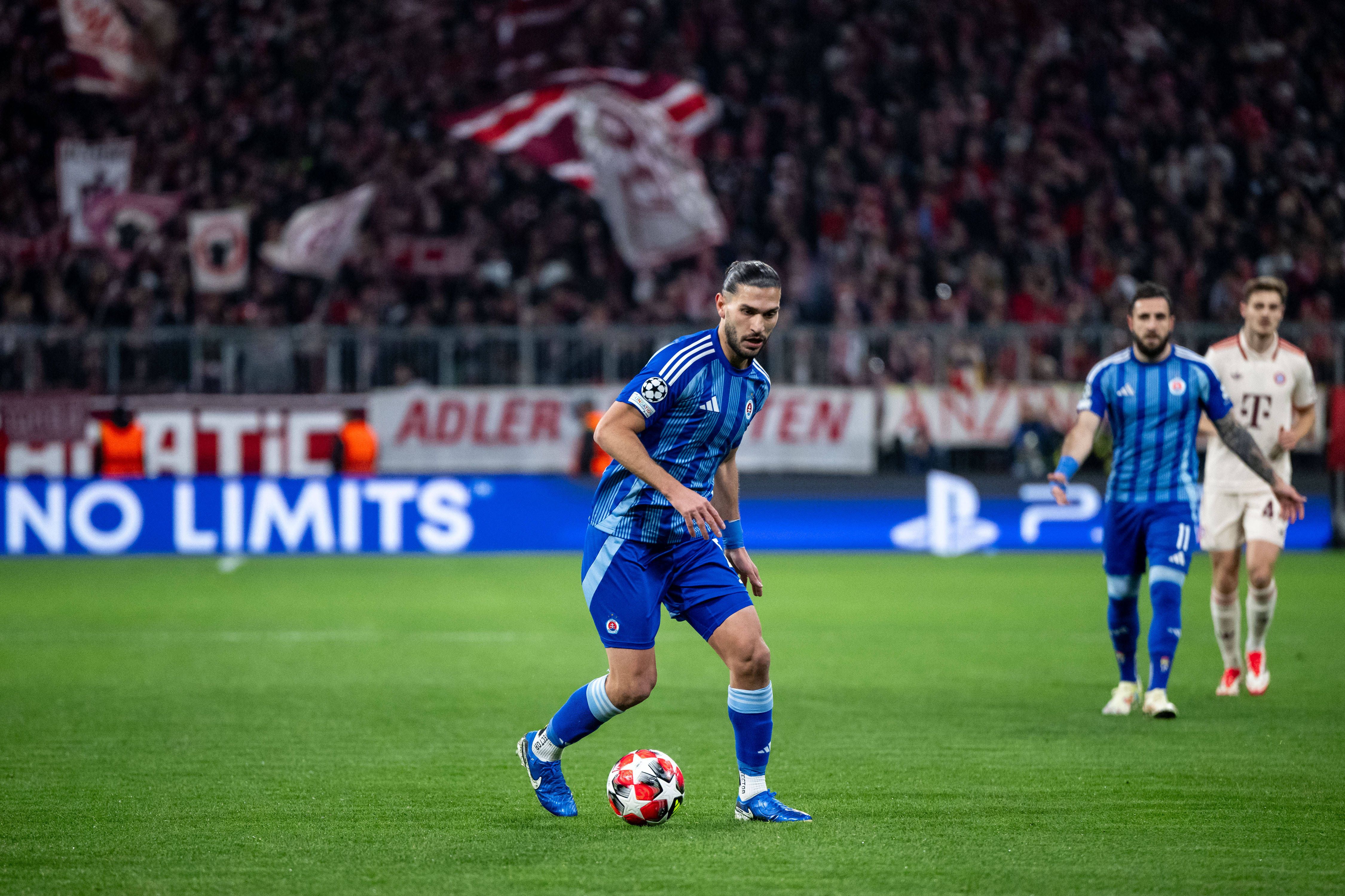 Kyriakos Savvidis (SK Slovan Bratislava, 88) am Ball, GER, FC Bayern Muenchen vs. SK Slovan Bratislava, Fussball, UEFA Champions League, 8. Spieltag, Spielzeit 2024 2025, 29.01.2025 GER, FC Bayern ...