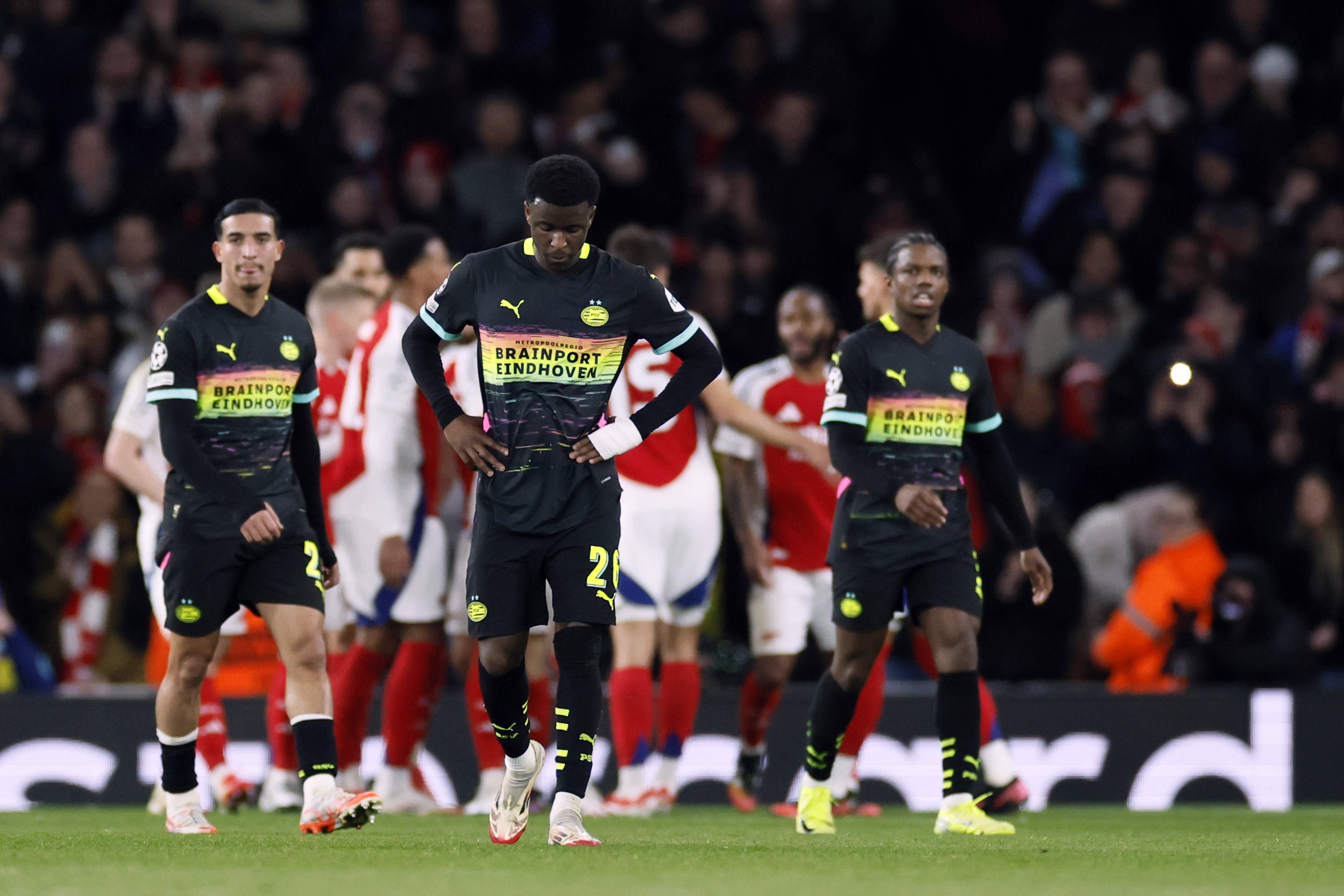 LONDON - (l-r) Couhaib Driouech of PSV Eindhoven, Isaac Babadi of PSV Eindhoven, Tyrell Malacia of PSV EIndhoven disappointment after the 2-1 during the UEFA Champions league match between Arsenal ...