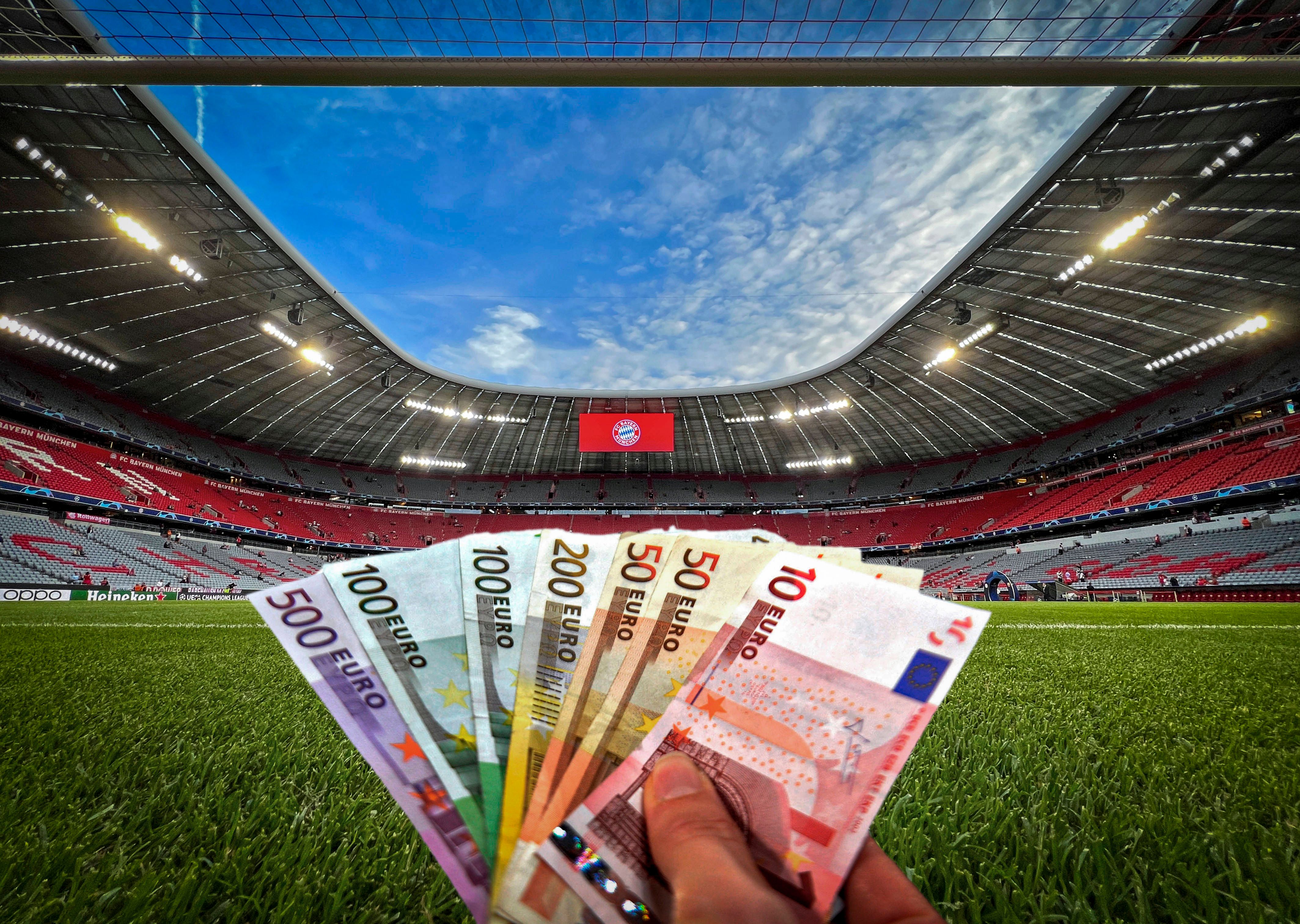 28.02.2024, Das Millionengeschäft Fussball Bundesliga (Symbolbild, Geldscheine am Spielfeldrand im leeren Stadion), *** 28 02 2024, The million-dollar business of the Bundesliga symbol image, bankn...