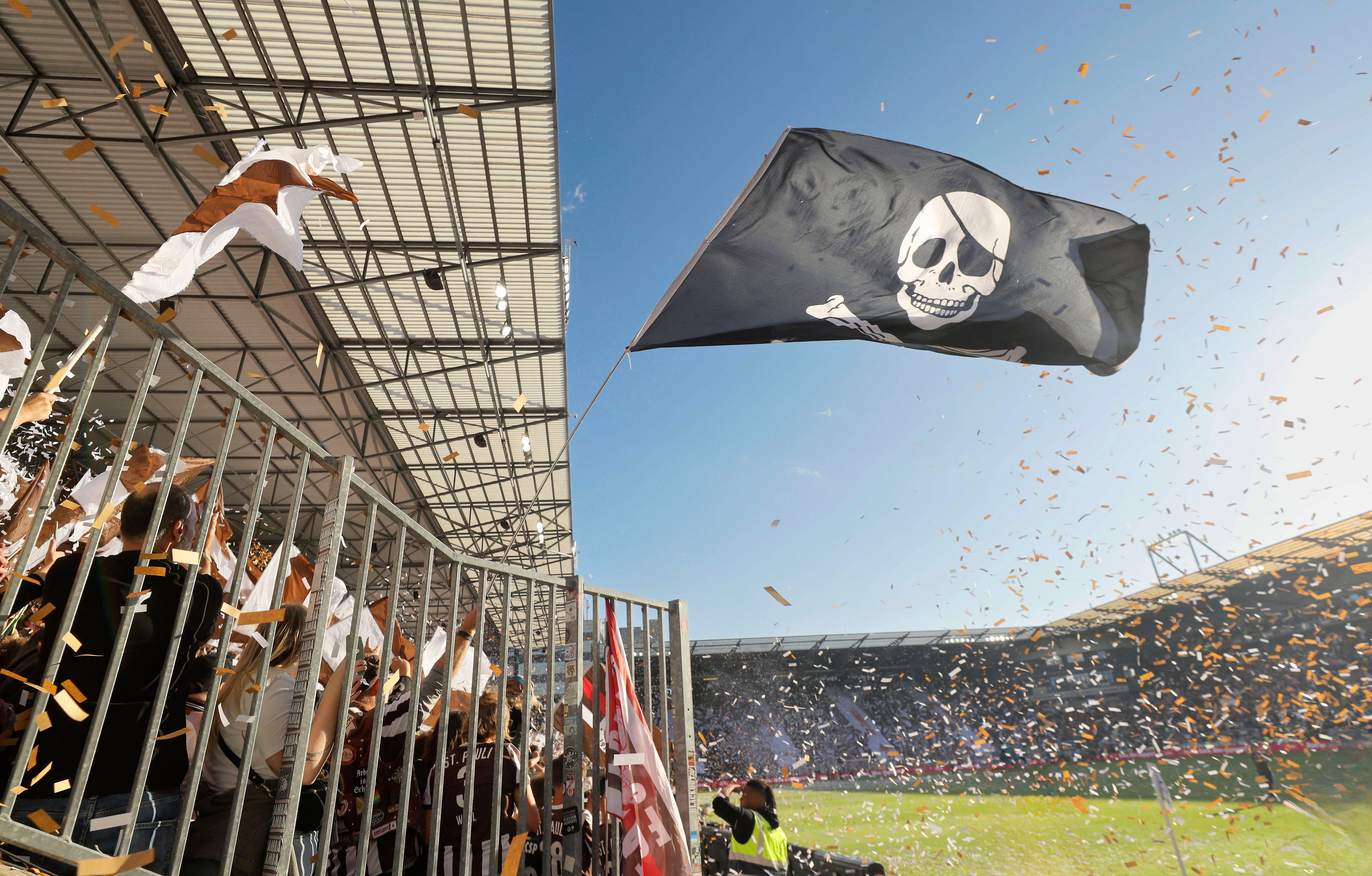 Foto : ein Fahnenmeer mit den Fans und zehntausende Konfetti Papierschnipsel zur Begrüssung der beiden Teams vor dem Anpfiff Fussball 1. Bundesliga , 1. Spieltag am Sa. 23.08.2025 FC St. Pauli - Bo...