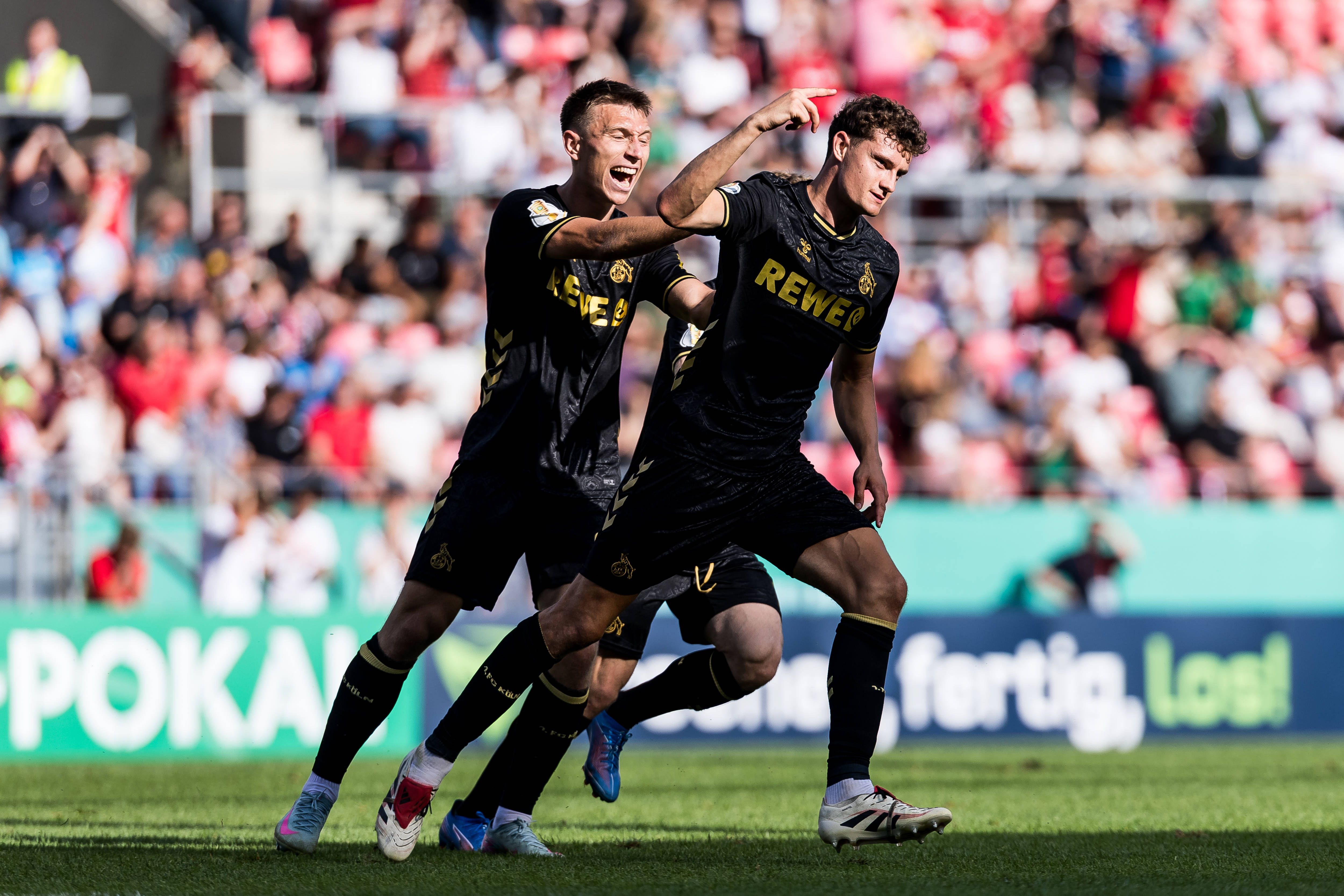 DFB Pokal: SSV Jahn Regensburg - 1. FC Köln; 17.08.2025 Jubel zum 1:1 durch Eric Martel (1. FC Köln, 6) DFB Pokal 1. Runde, SSV Jahn Regensburg - 1. FC Köln, Regensburg, Jahnstadion am 17.08.2025 D...