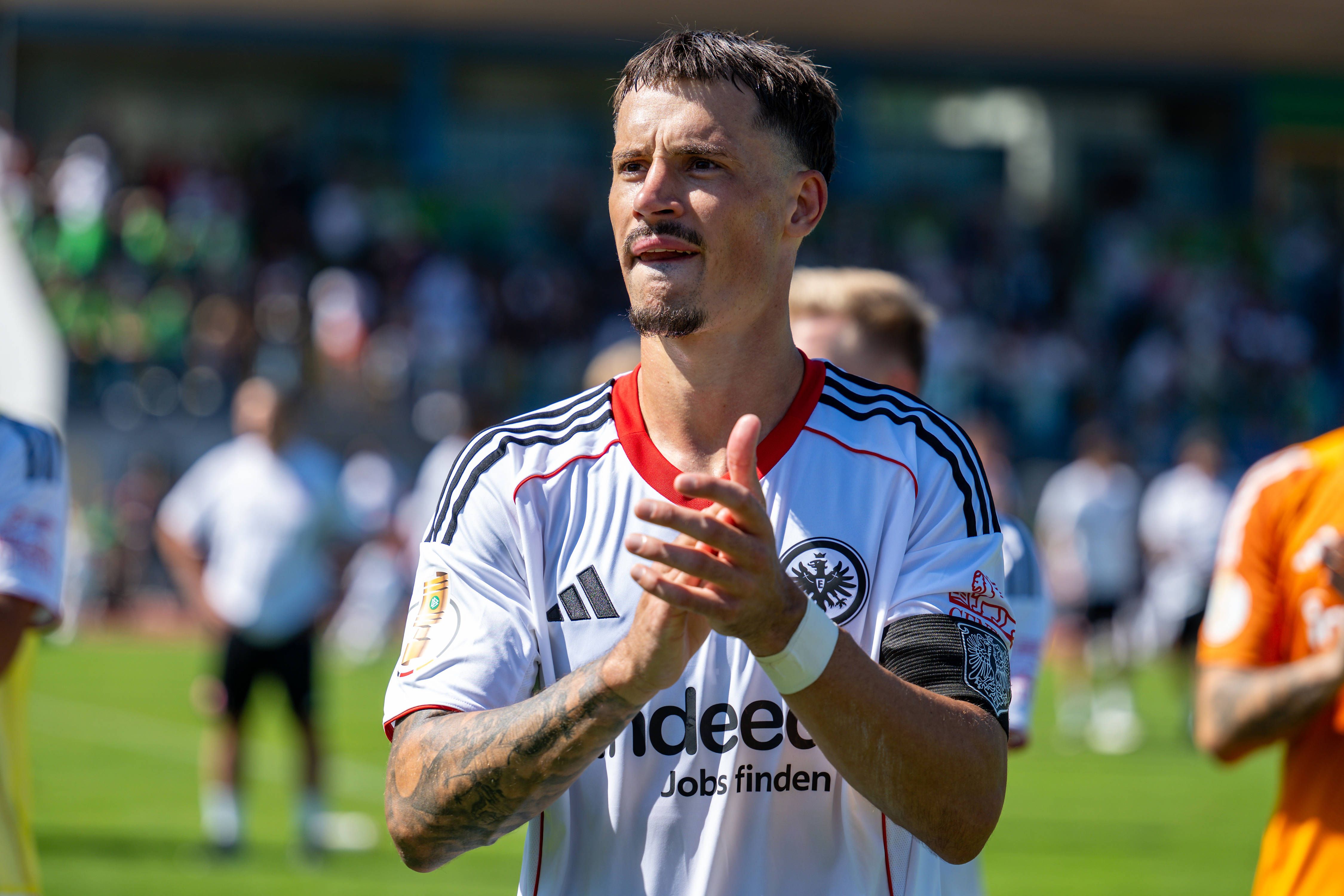Robin Koch (Frankfurt, 04) bedackt sich bei den Fans, GER, FV Engers 07 vs Eintracht Frankfurt, Fussball Herren DFB Pokal, 1. Runde, Saison 2025 2026, 17.08.2025 DFB regulations prohibit any use of...