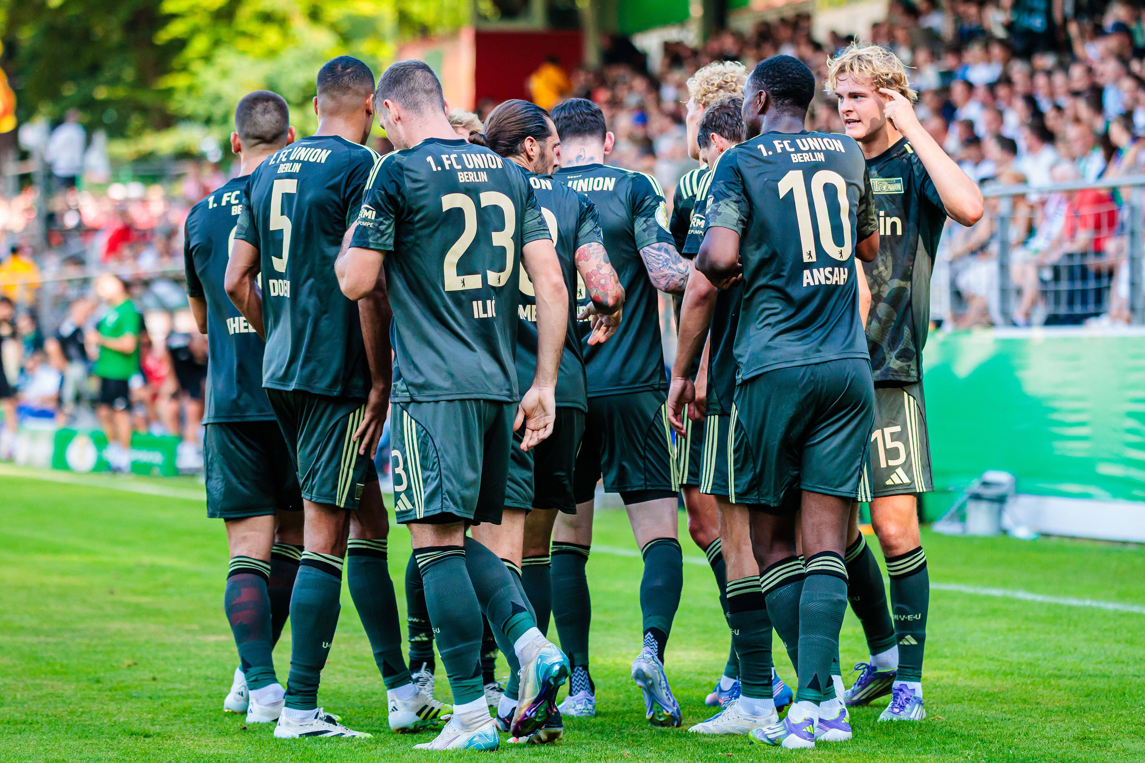 Die Mannschaft von 1. FC Union Berlin jubelt nach Tor zum 0:1 durch Robert Skov (1. FC Union Berlin, 24) GER, FC Guetersloh vs. 1. FC Union Berlin, Fussball, DFB-Pokal, 1. Runde, Spielzeit 2025 202...