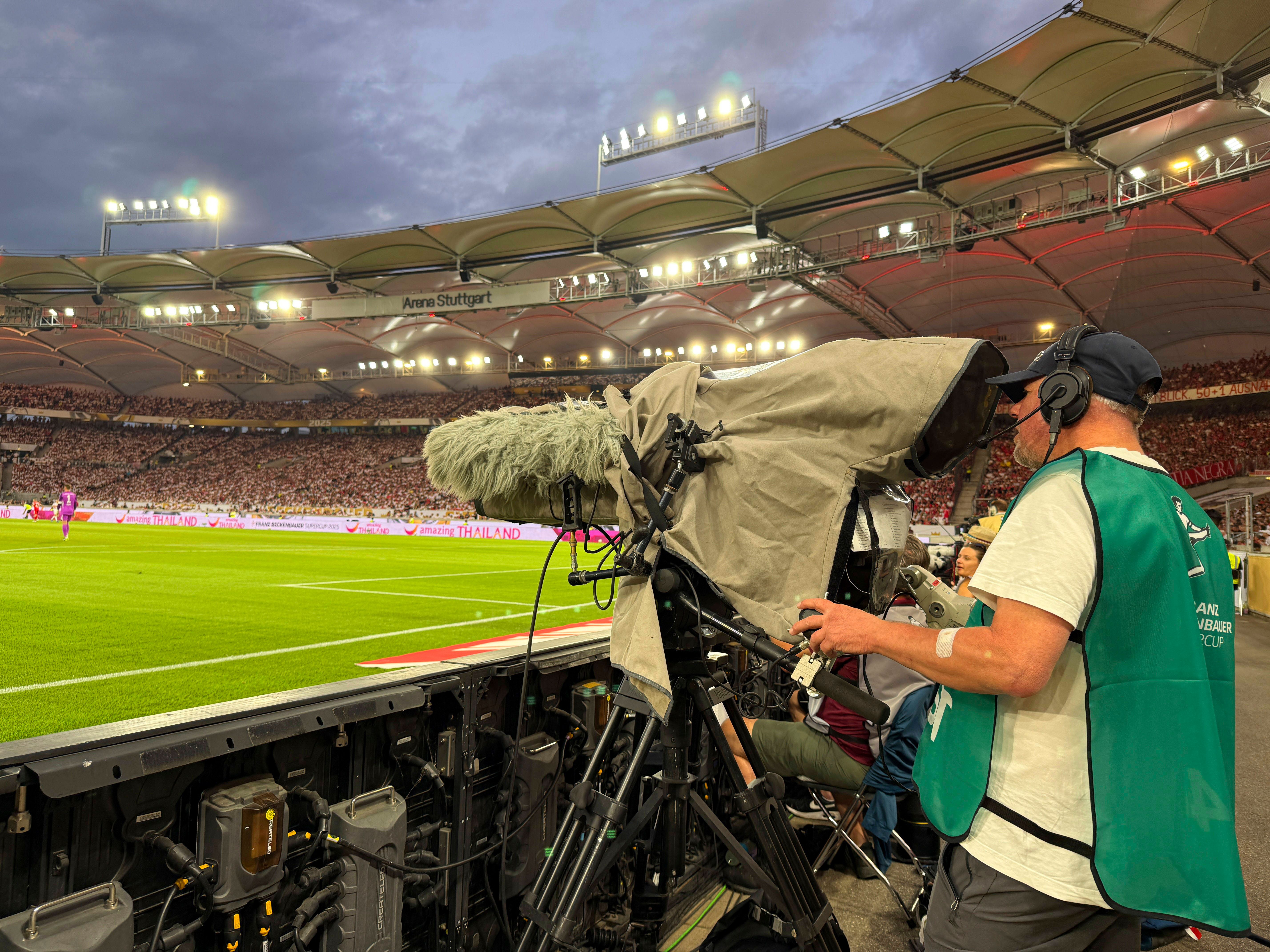 16.08.2025, Fussball Bundesliga 2025 2026, Franz-Beckenbauer-Supercup, VfB Stuttgart - FC Bayern München, in der MHP-Arena (Stuttgart). Übersicht Stadion.Kameramann am Spielfeldrand *** 16 08 2025,...