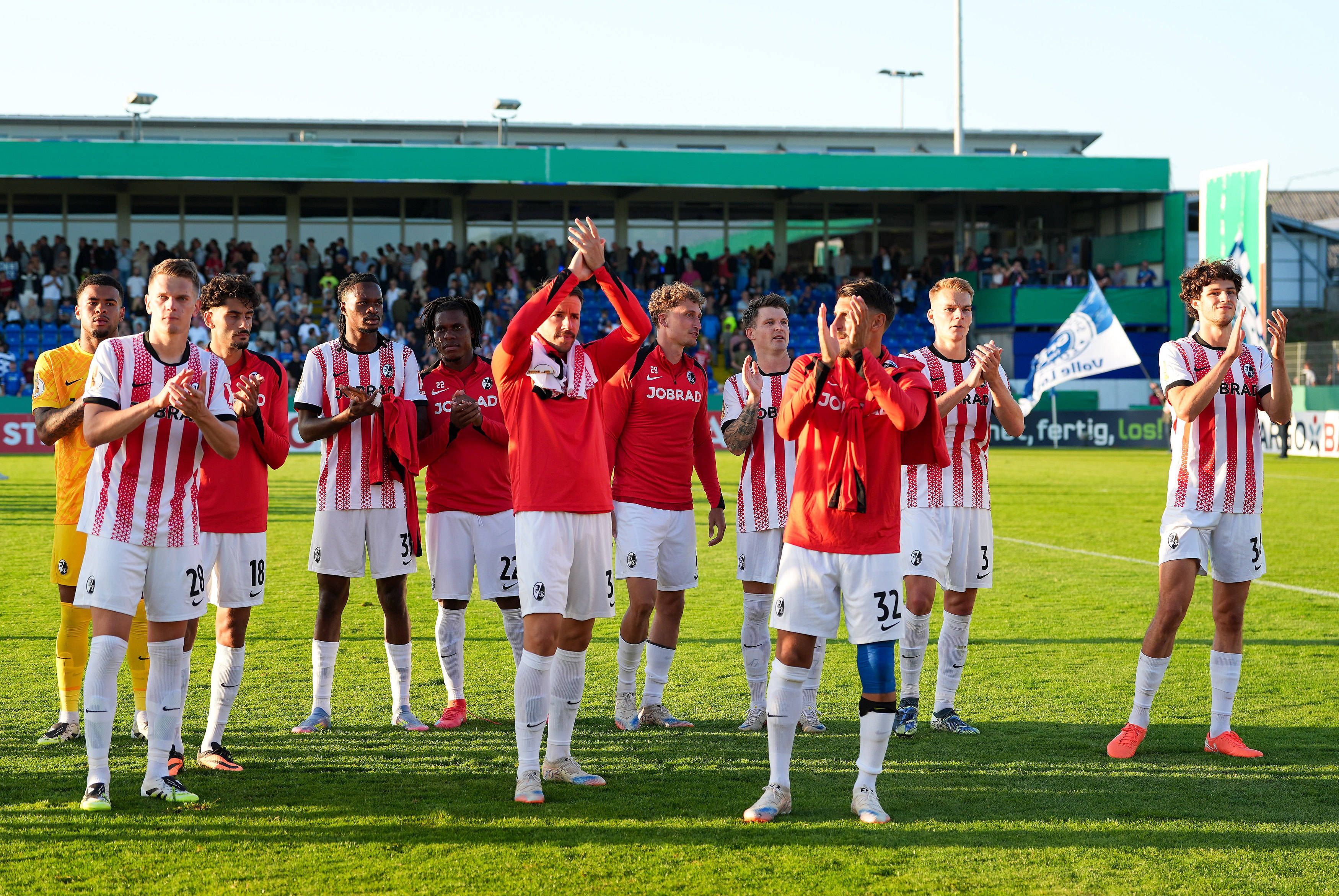 SC Freiburg Spieler feiern nach einem 2:0-Sieg. GER, VfL Sportfreunde Lotte 1929 vs SC Freiburg, Fussball, DFB-Pokal, 1. Runde, Saison 2025 2026, 16.08.2025 DFL REGULATIONS PROHIBIT ANY USE OF PHOT...