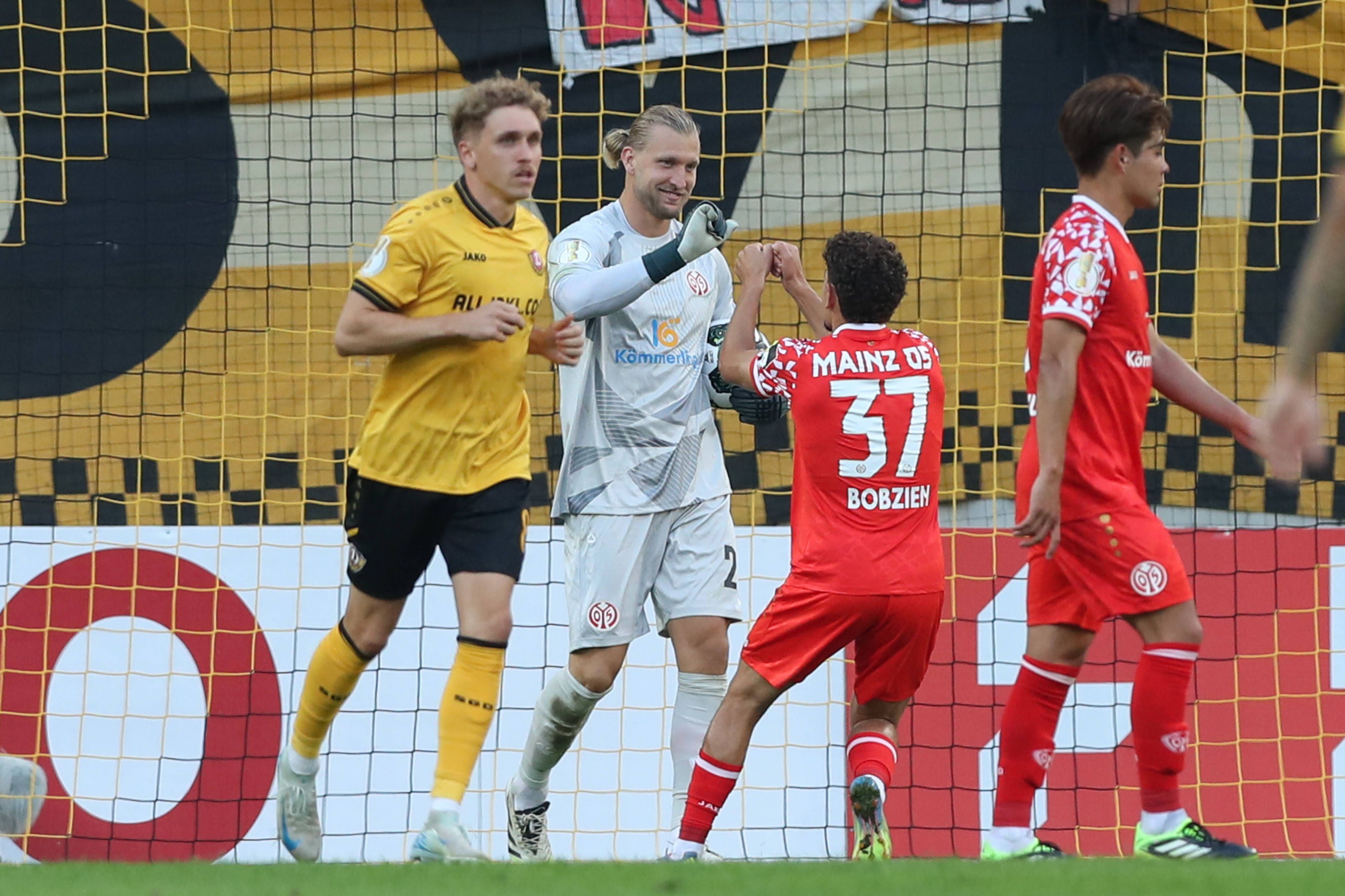 18.08.2025, xtgx, Fussball DFB Pokal 1. Runde, SG Dynamo Dresden - 1. FSV Mainz 05 emspor, v.l. Robin Zentner (Mainz, 27) hält Elfmeter von Jakob Lemmer (Dresden, 10) Parade, haelt den Ball, faengt...
