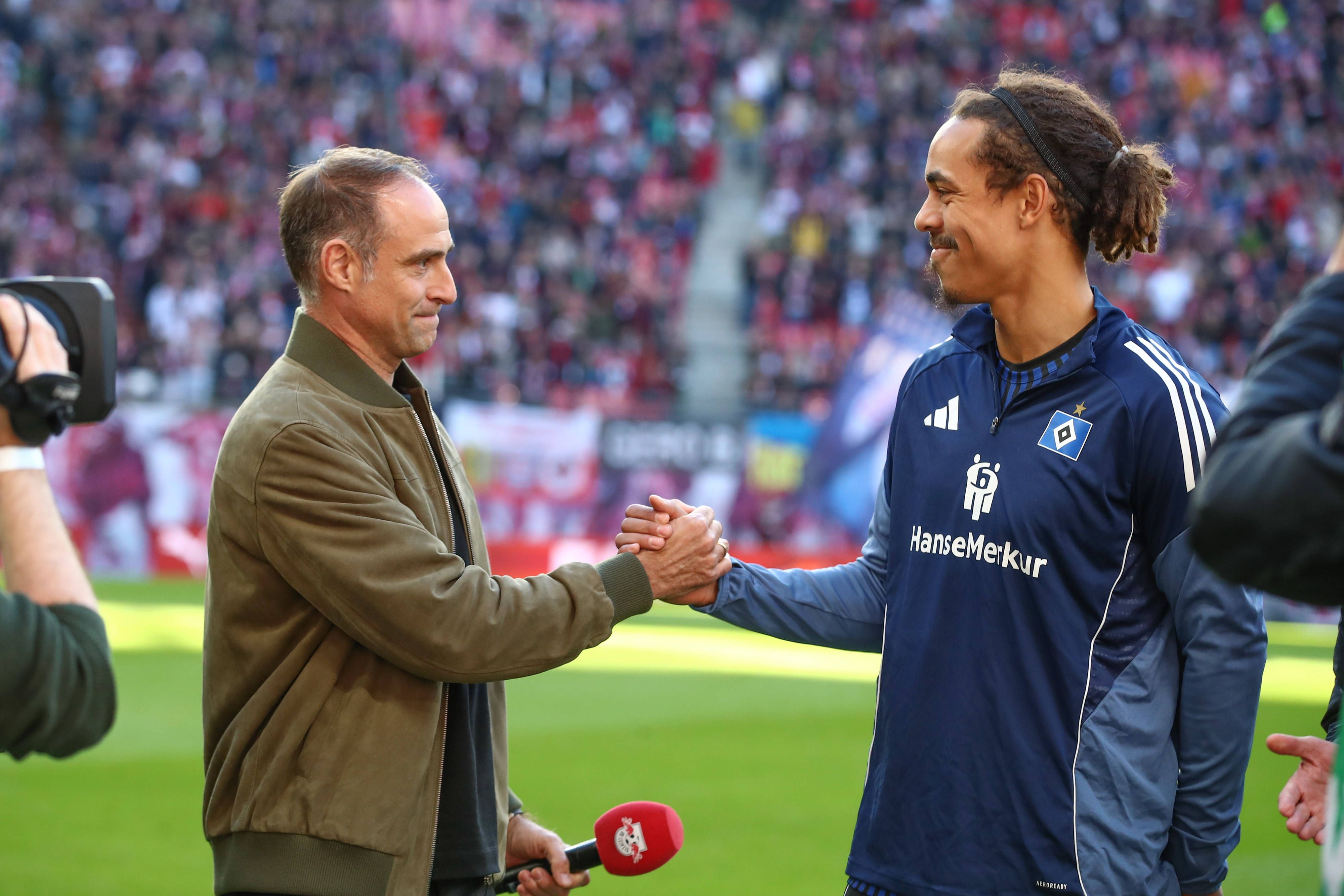 18.10.2025, xtgx, Fussball 1. Bundesliga, RB Leipzig - Hamburger SV emspor, v.l. Oliver Mintzlaff (RB) verabschiedet Yussuf Poulsen (HSV, 15) (DFL DFB REGULATIONS PROHIBIT ANY USE OF PHOTOGRAPHS as...