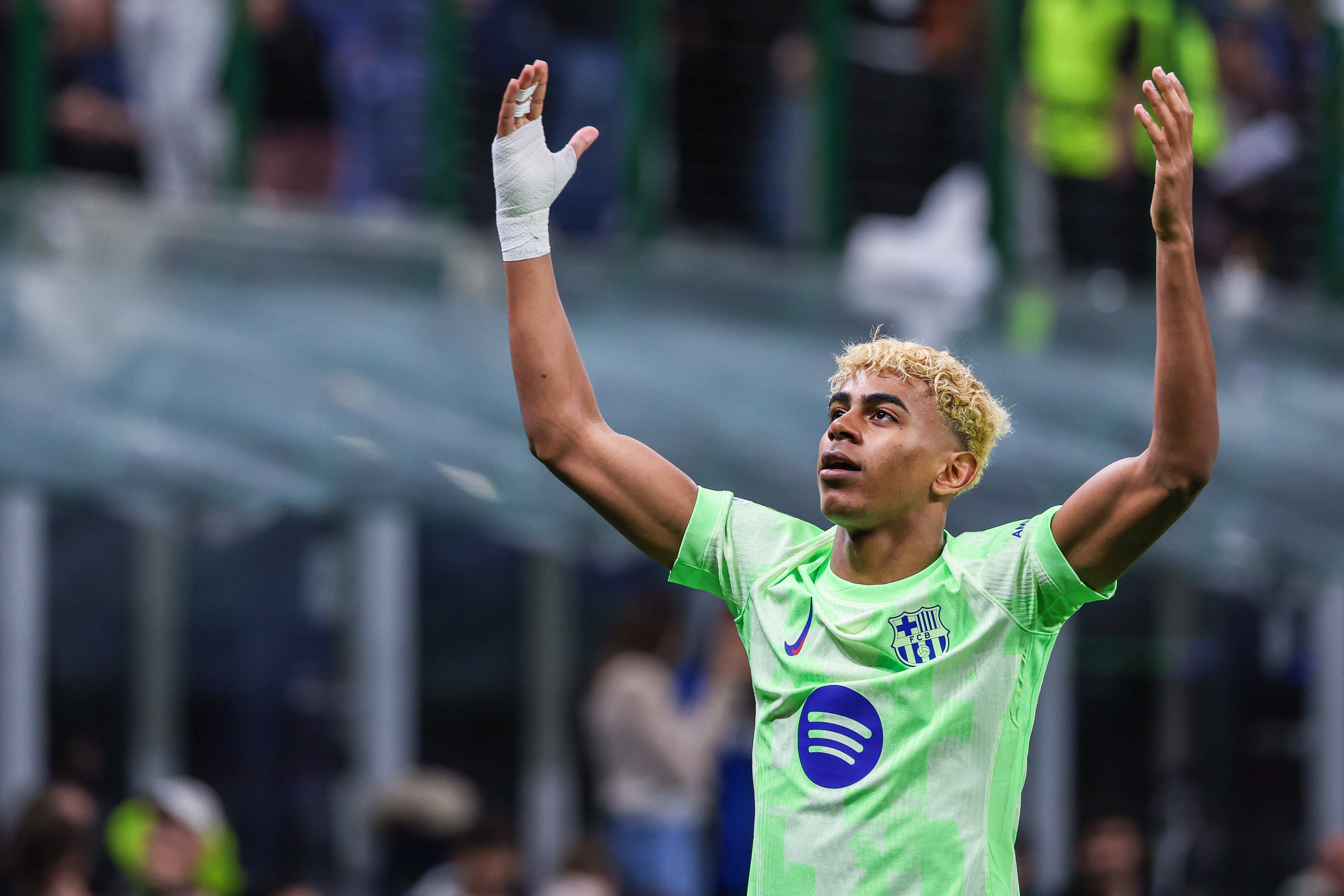 Lamine Yamal of FC Barcelona, Barca celebrates during UEFA Champions League 2024 25 Semi Final - 2nd leg football match between FC Internazionale and FC Barcelona at San Siro Stadium PUBLICATIONxNO...