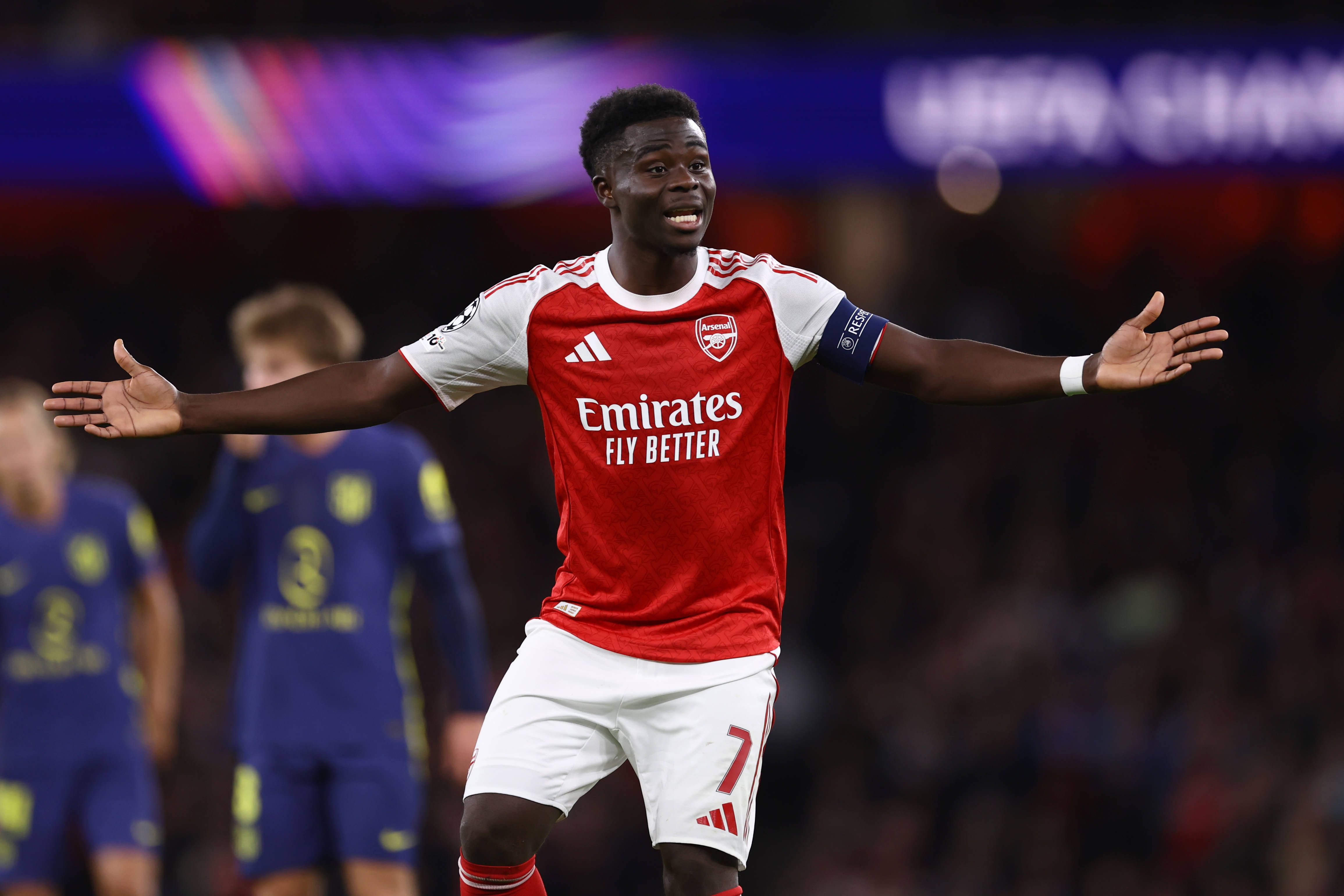 Arsenal v Atletico Madrid 21 October 2025, London - UEFA Champions League - League Stage - Arsenal v Atletico Madrid - Bukayo Saka of Arsenal makes an appeal to a match official - Photo: Jacques Fe...