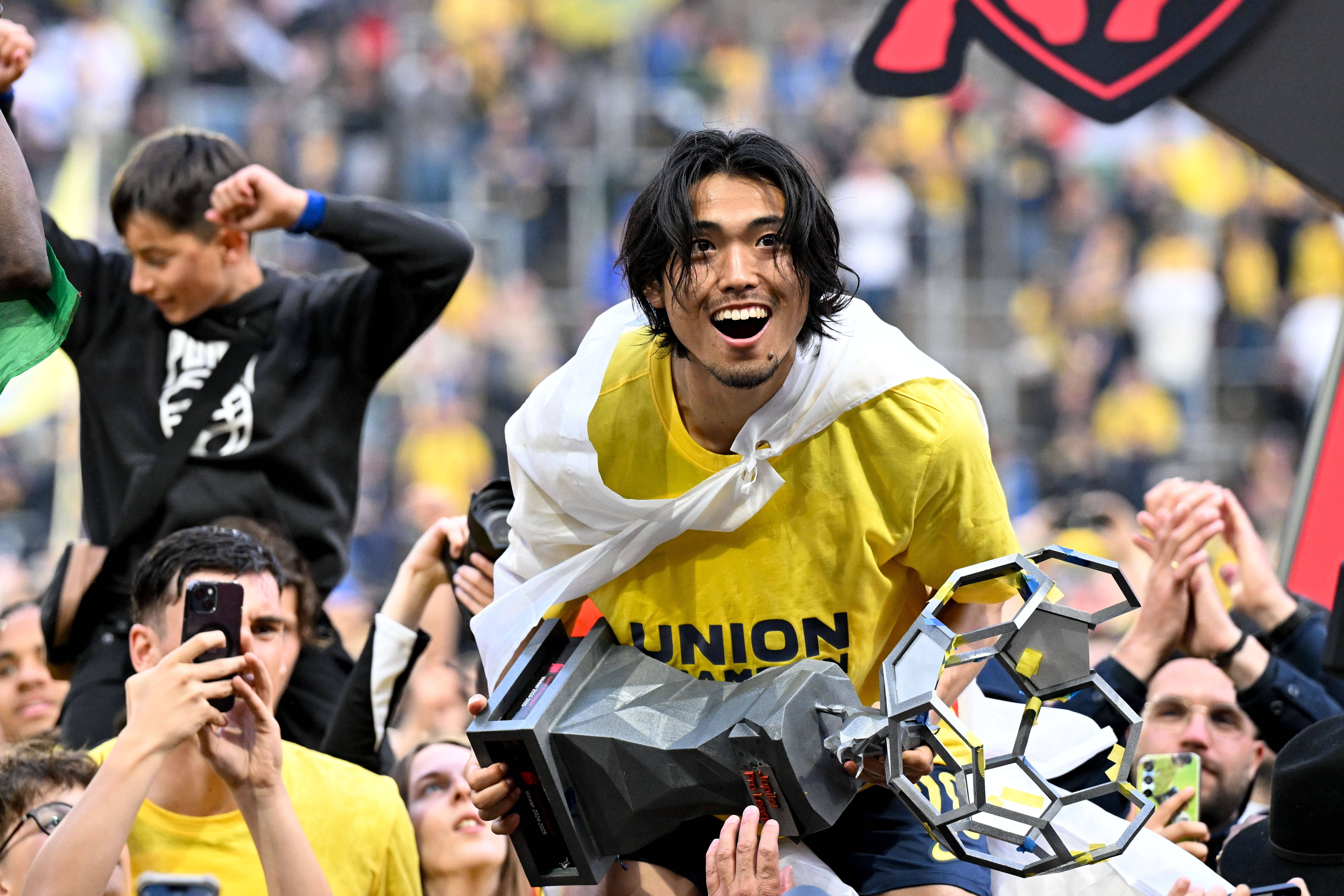 250525 Royale Union Saint-Gilloise vs AA Gent Koki Machida (28) of Union celebrating after winning the Jupiler Pro League season 2024 - 2025 after matchday 10 of the Champions Play offs between Roy...