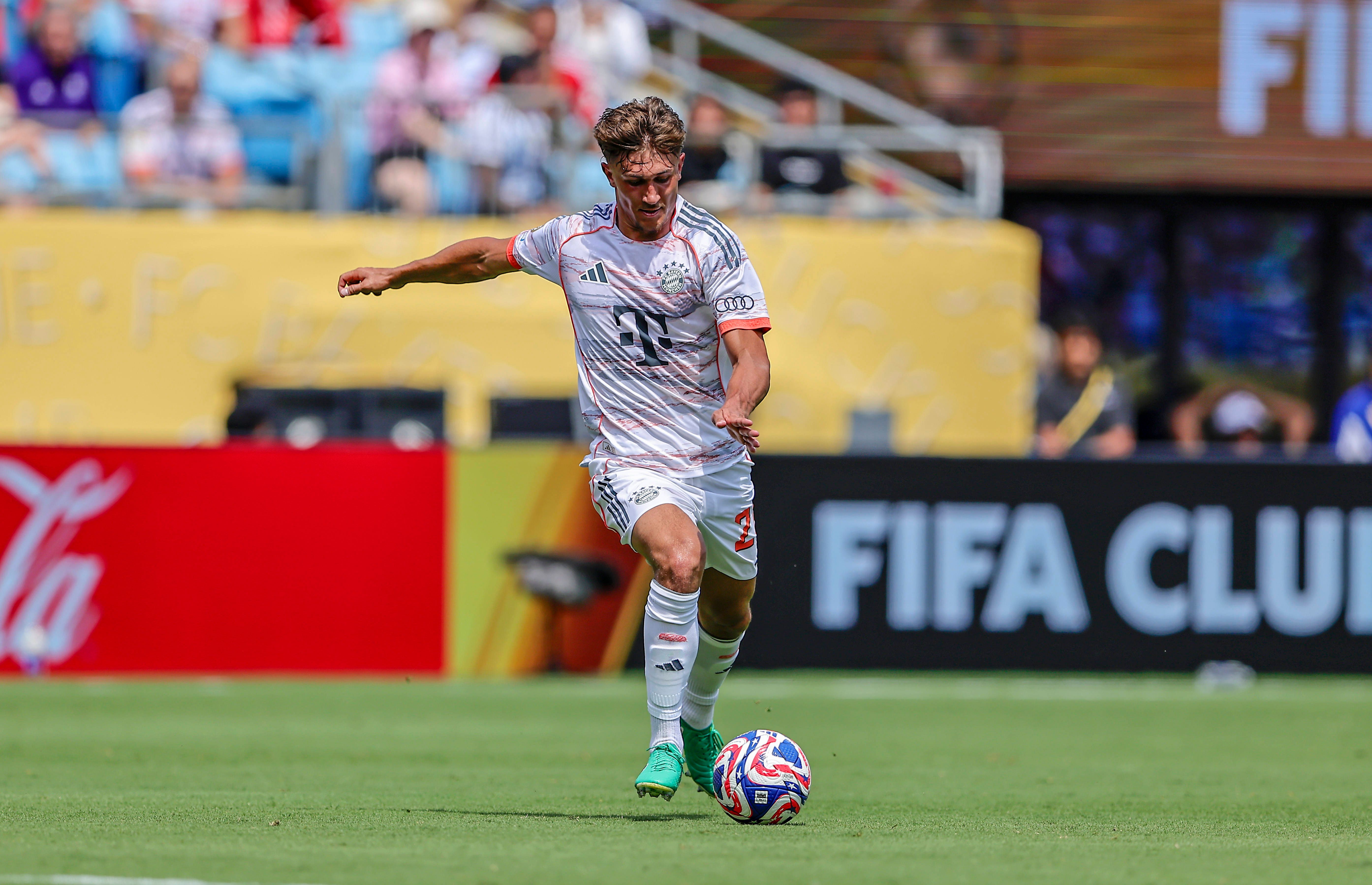 24.06.2025, FIFA Club World Cup 2025, Gruppe C, Benfica Lissabon - FC Bayern München, im Bank of America Stadium (Charlotte, NC), Tom Bischof (Bayern München) am Ball *** 24 06 2025, FIFA Club Worl...