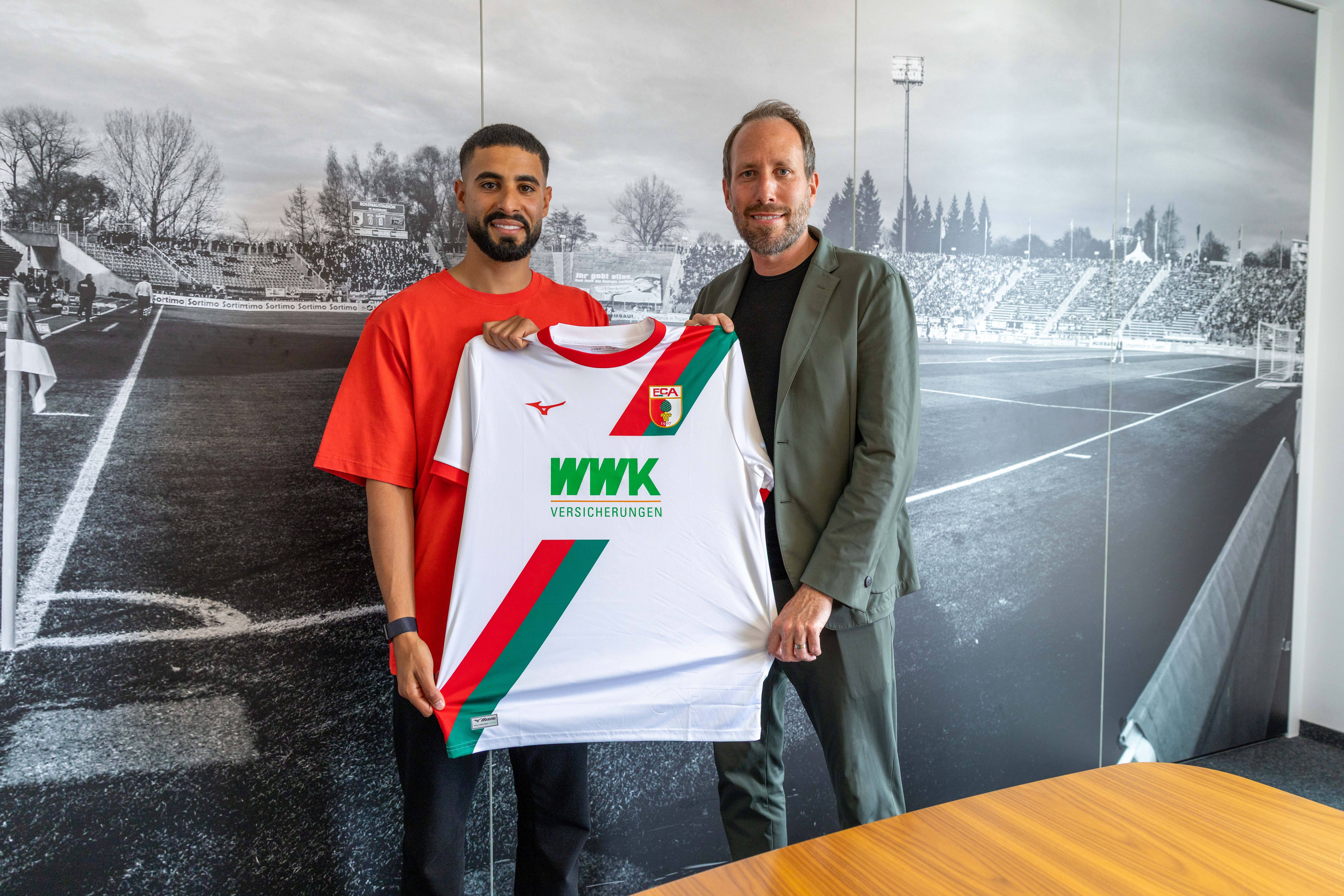 26.06.2025, GER, Fussball, Herren, FC Augsburg, Bundesliga, Neuzugang, Elias Saad, FCA, Neuzugang Elias Saad (r.) mit FCA-Geschäftsführer Michael Ströll *** 26 06 2025, GER, Soccer, Men, FC Augsbur...