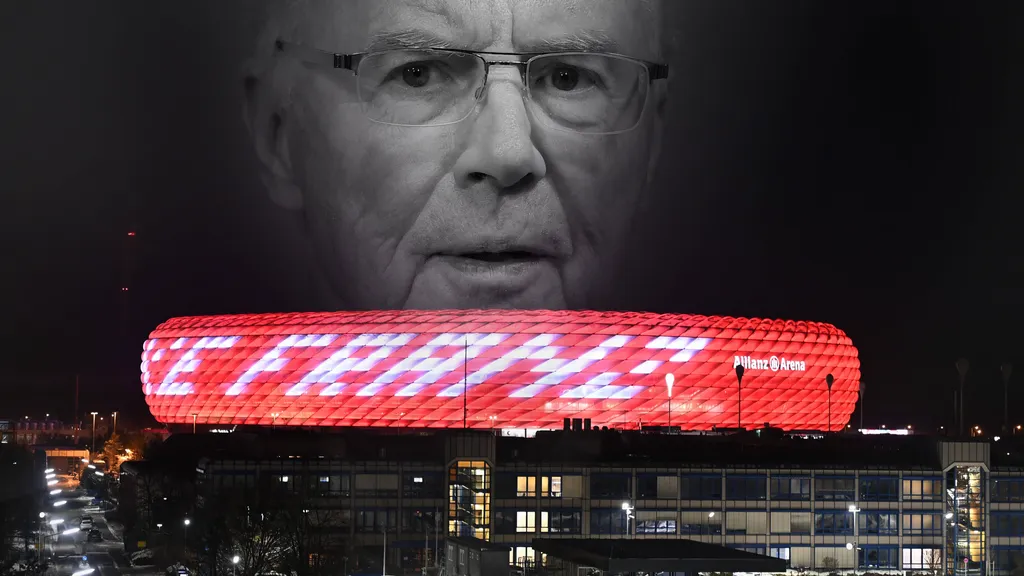 Zum Tod von Franz Beckenbauer (7. Januar 2024) leuchtete die Allianz Arena in Rot mit einem Franz-Beckenbauer-Schriftzug. Der "Kaiser" hat den Verein geprägt wie kaum ein anderer und erhielt daher die besondere Ehre.IMAGO/Sven Simon