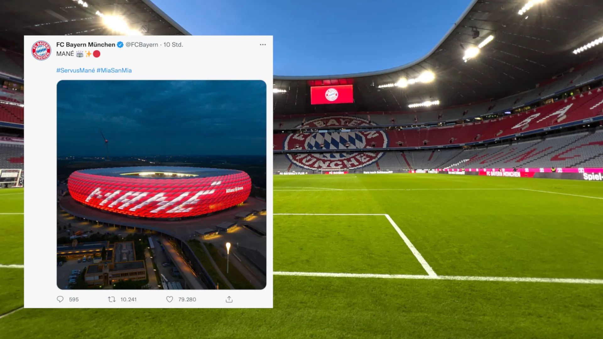 Am Tag der Vorstellung von Superstar Sadio Mane leuchtete die Heimstätte des Rekordmeisters in Rot und der Aufschrift "Mane". Eine besondere Würdigung für die begeistert empfangene fußballerische Attraktion an der Isar.Imago Images / Twitter @FCBayern