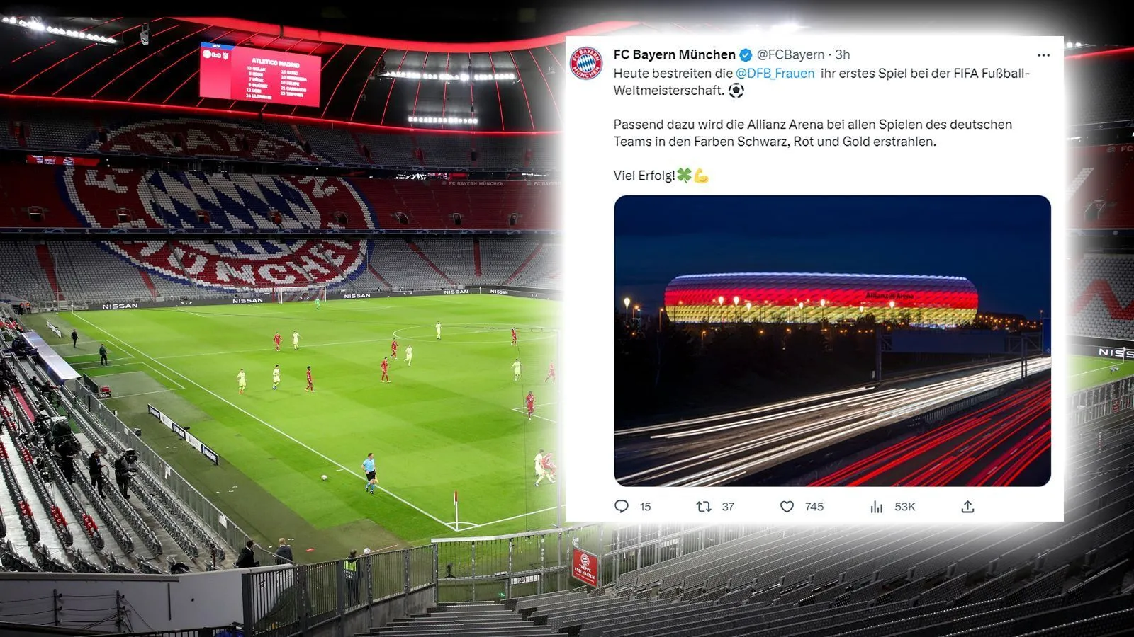 In München hat man sich während der Frauenfußball-WM 2023 in Australien und Neuseeland etwas ganz Besonderes einfallen lassen. Wie der FC Bayern mitteilte, erstrahlte die Allianz Arena während der Spiele der deutschen Nationalmannschaft in Schwarz-Rot-Gold. Viel genutzt hat es leider nicht. Das DFB-Team schied schon nach der Vorrunde aus.imago/twitter@fcbayern
