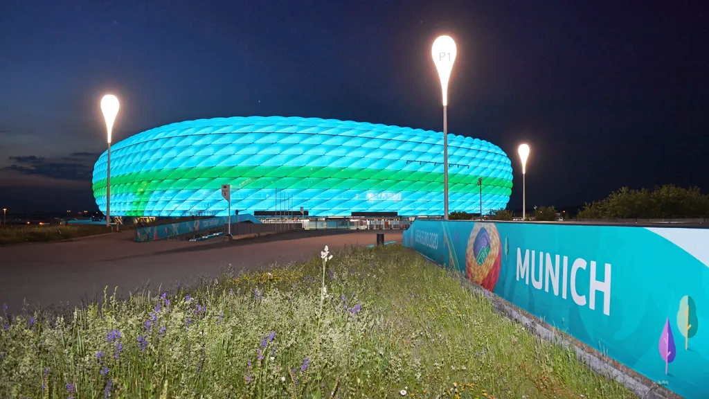 Im Rahmen der Europameisterschaft 2021 war die Allianz Arena in München eine Spielstätte. Daher leuchtete die Heimspielstätte des FCB damals auch passend zur EURO 2021.imago images/Sven Simon