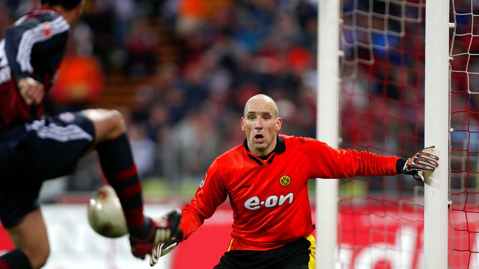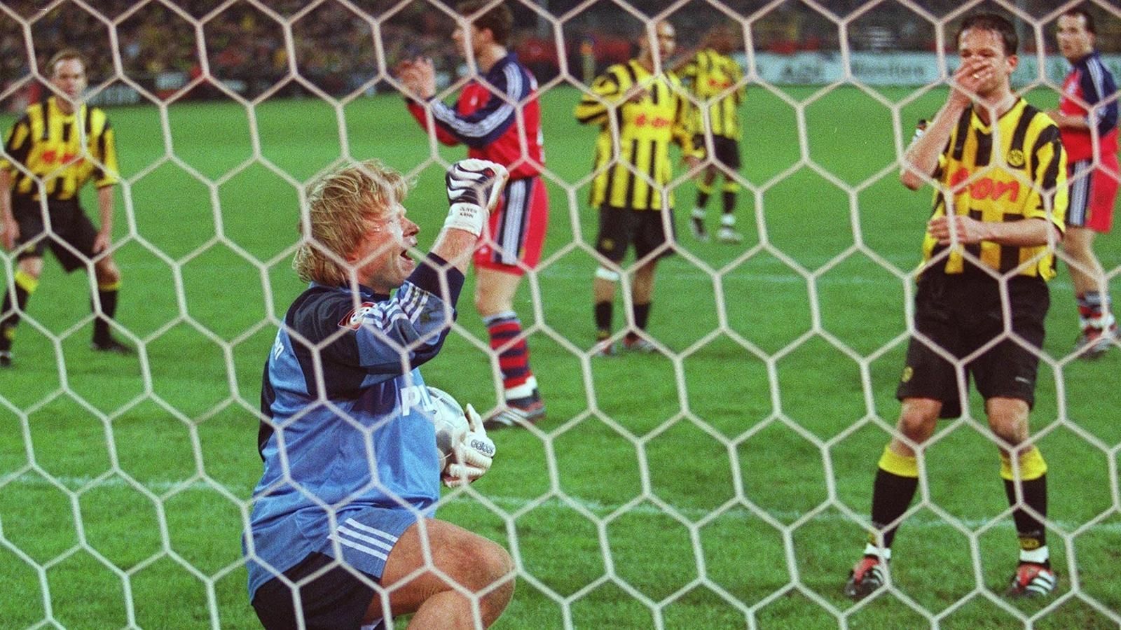 Wieder ein Abendspiel unter der Woche. Besonders hitzige Atmosphäre. Nach Platzverweisen gegen Bixente Lizarazu und Stefan Effenberg stehen nur noch neun Münchner gegen den BVB auf dem Platz. Tomas Rosicky tritt zum Freistoß an. Und trifft ganz genau. Zu genau. Der Ball klatscht an den Pfosten und kullert die Linie entlang in die Hände von Oliver Kahn. Es bleibt beim 1:1.Getty Images