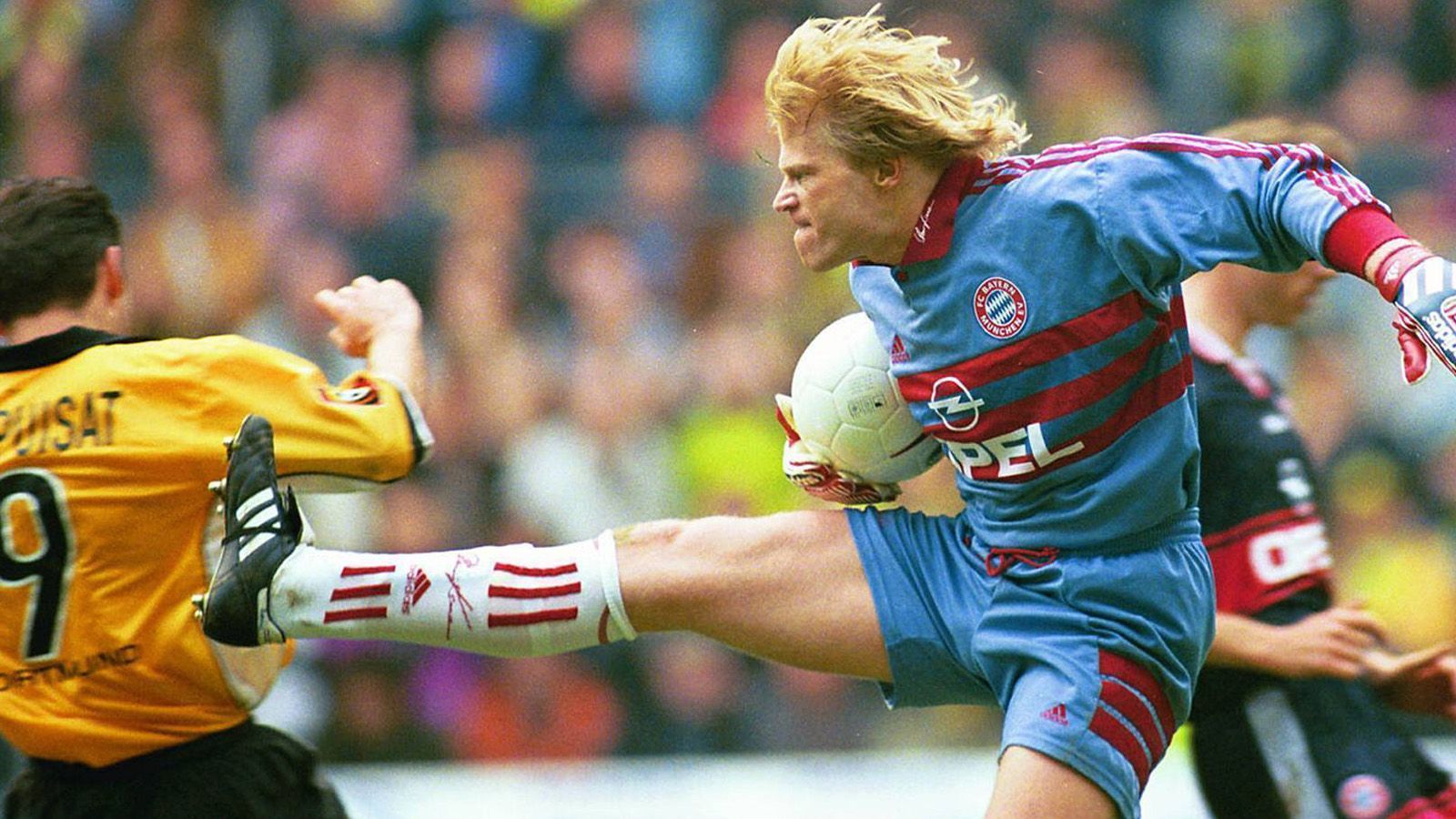 Es ist wohl DAS Duell schlechthin. Die Bayern sind seit zehn Spielen ungeschlagen, der Mega-Favorit. Doch der BVB spielt die Münchner in den ersten Minuten an die Wand, führt nach 32 Minuten mit 2:0. Bei Oliver Kahn brennen die Nerven durch. Erst der Kung-Fu-Tritt knapp an Stephane Chapuisat vorbei ...imago sportfotodienst