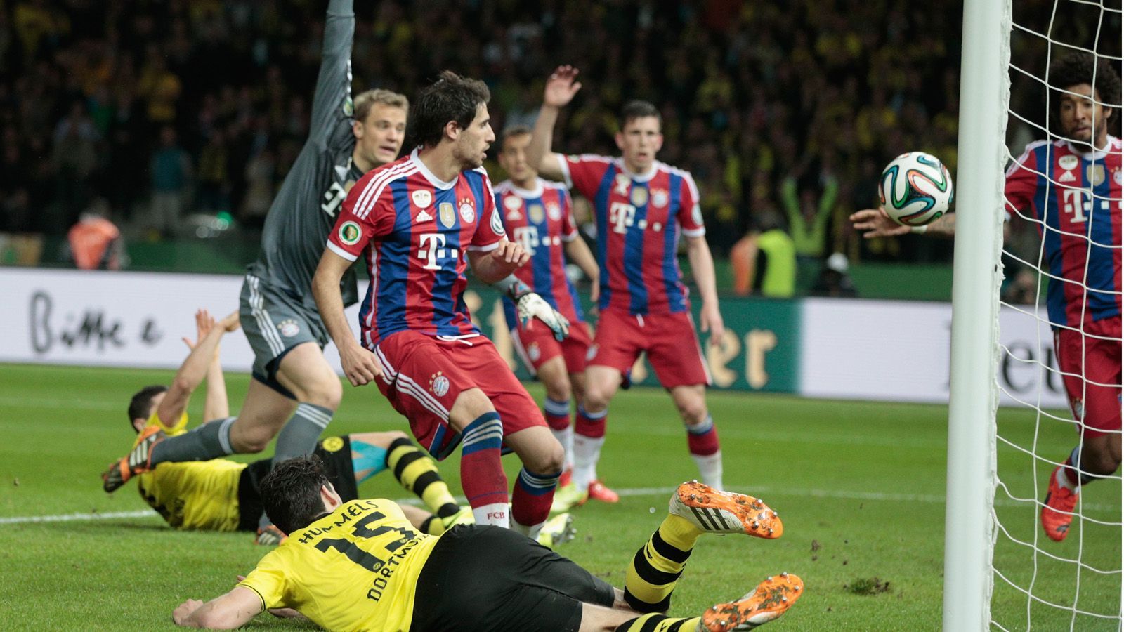 Es ist womöglich die Szene, die die Einführung der Torlinien-Technik forciert: Mats Hummels' nicht gegebenes Tor für den BVB. Ausgerechnet beim größten Spiel der Saison kommt es zur Fehlentscheidung und das Spiel bekommt 30 Extra-Minuten. Der FC Bayern gewinnt nach der Verlängerung mit 2:0. Im Hintergrund schön zu sehen: Der berühmte Reklamierarm von Manuel Neuer.imago/Matthias Koch