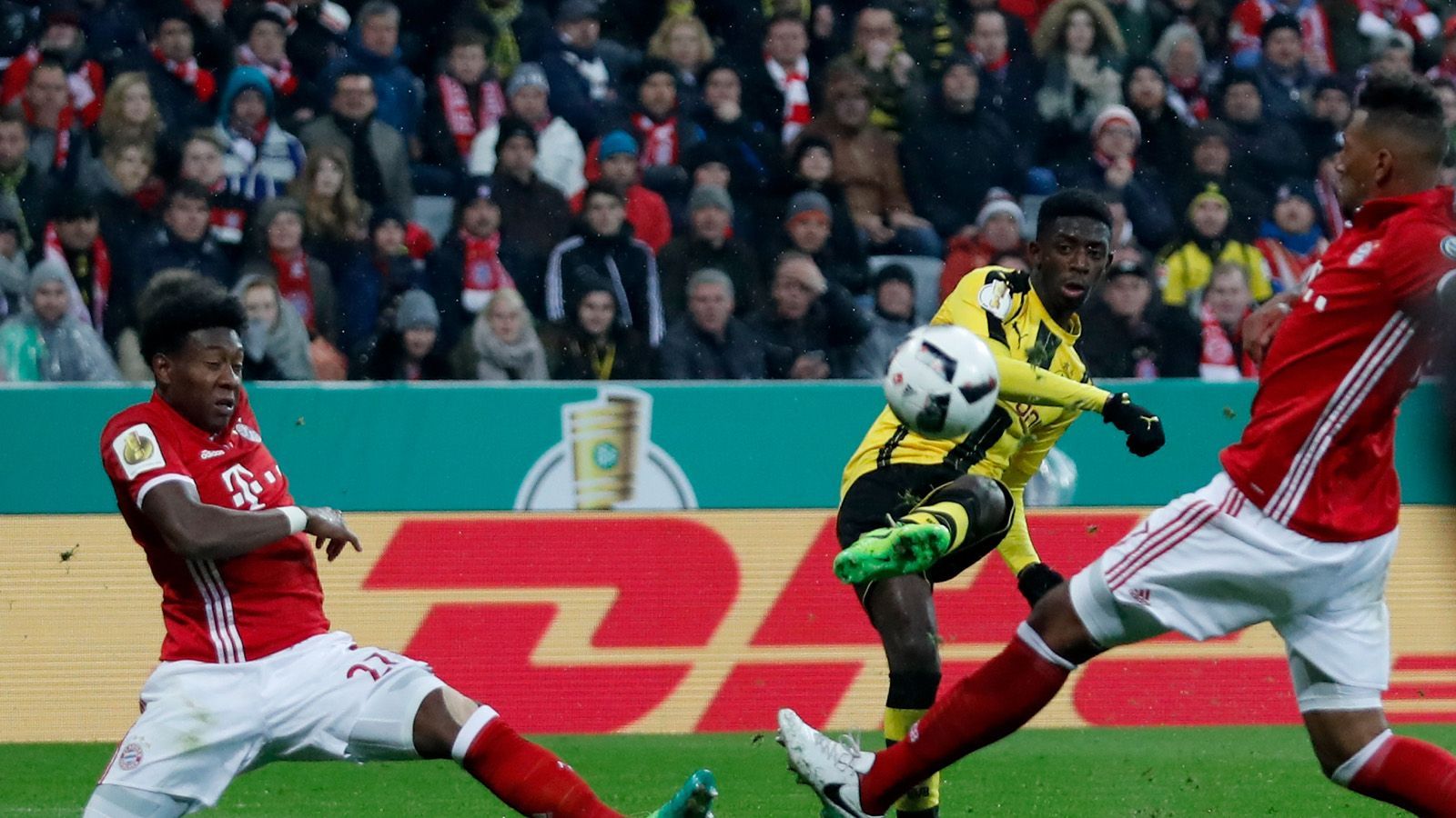 In der Saison 2016/17 treffen die Münchner im Pokal-Halbfinale zuhause auf Borussia Dortmund und gehen leer aus. In einem packenden Pokalfight gelingt zunächst Dortmund durch Marco Reus der Führungstreffer, dann drehen die Bayern das Spiel durch Tore von Javi Martinez und Mats Hummels - um nach der Pause alles zu verspielen. Zunächst sorgt Pierre-Emerick Aubameyang für den BVB-Ausgleich, ehe Ousmane Dembele (Mi.) den Ball in der 74. Minute nach einer tollen Einzelleistung zum 3:2-Siegtreffer für Dortmund im Winkel versenkt...2017 Getty Images