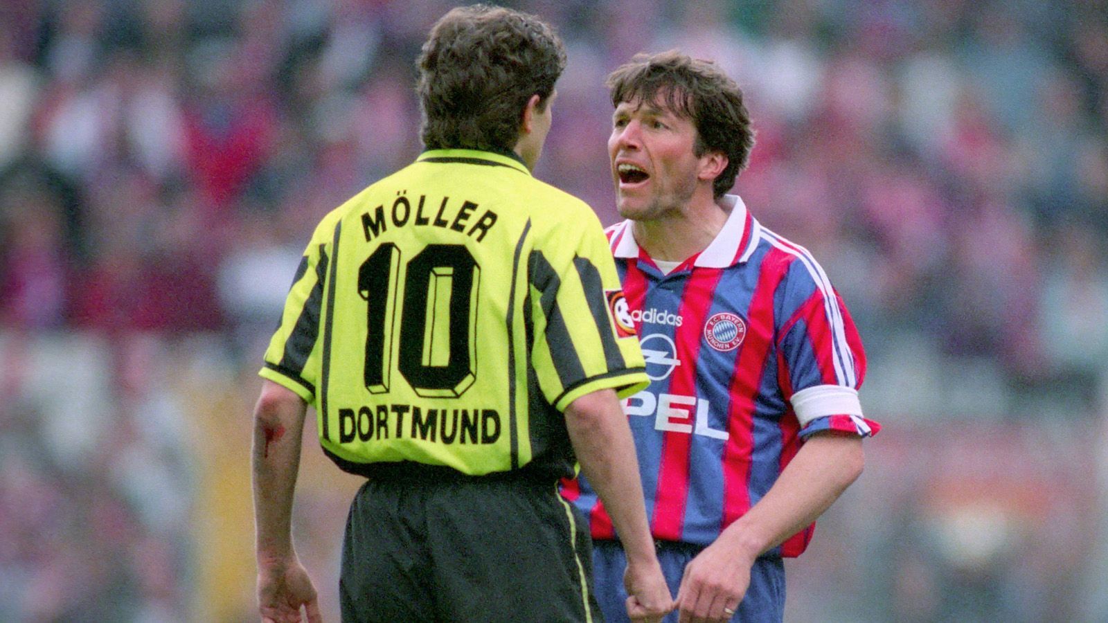 Auf der Trainerbank heißt das Duell noch Giovanni Trapattoni gegen Ottmar Hitzfeld. Auf dem Spielfeld Andreas Möller gegen Lothar Matthäus. Als Möller nach einem Foul von Mario Basler übertrieben abhebt, knöpft sich Matthäus den Dortmunder vor und geigt seinem Nationalmannschaftskollegen die Meinung.imago sportfotodienst