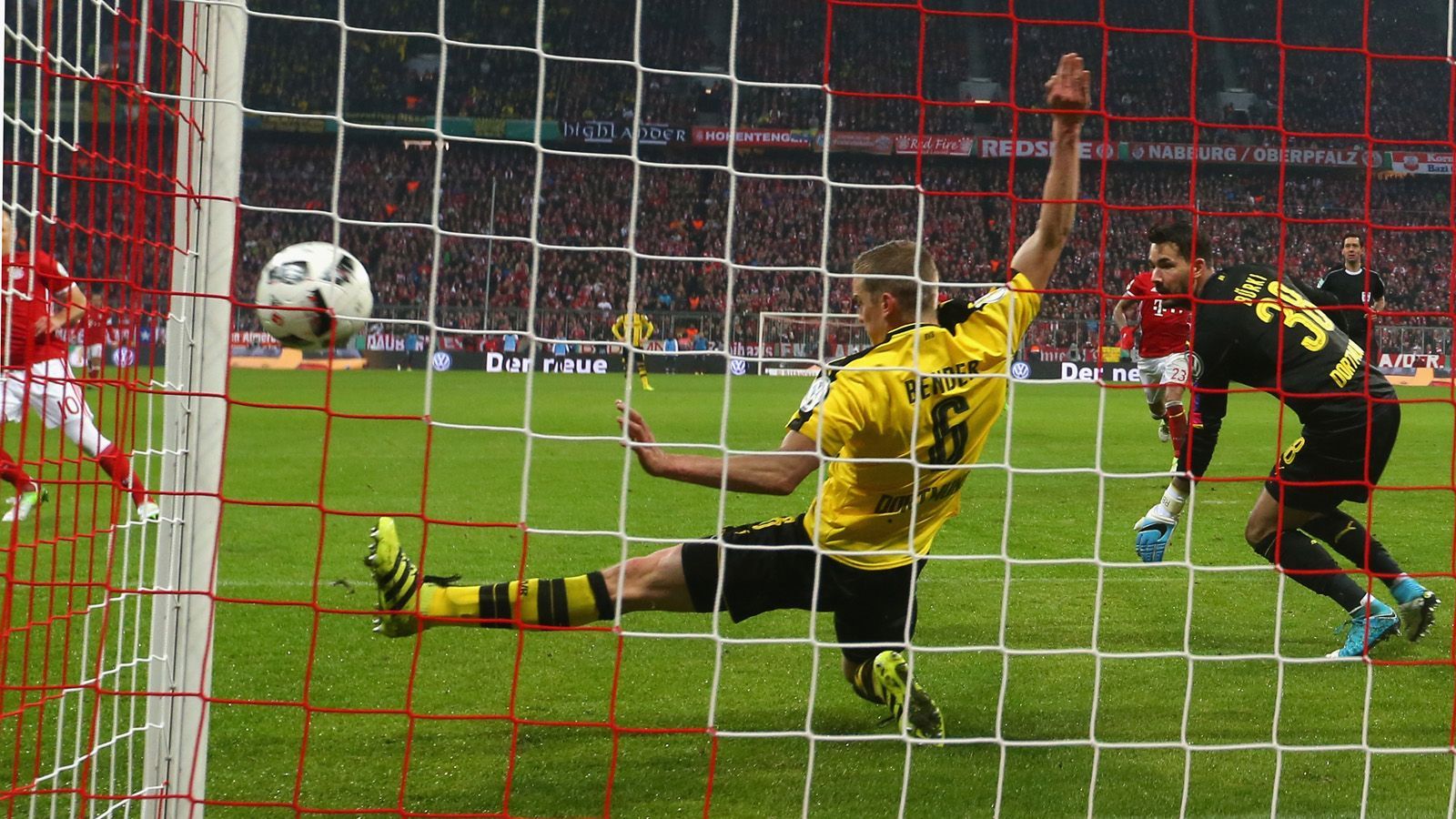 Die wohl entscheidende Szene des Spiels ereignet sich jedoch auf der anderen Seite des Spielfeldes, als Sven Bender in der 63. Minute beim Stand von 2:1 für die Bayern einen Schuss von Arjen Robben auf der Torlinie gerade noch heldenhaft weggrätscht und somit den fast schon sicheren dritten Gegentreffer verhindert - es ist der Auftakt zu einer imposanten Wende in der Allianz Arena. Im Pokalfinale setzt sich Dortmund dann mit 2:1 gegen Eintracht Frankfurt durch und sichert sich den vierten DFB-Pokal-Titel.imago/Thomas Frey