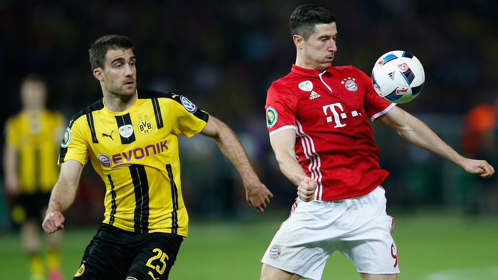 Im Pokalduell zwischen Bayern und Dortmund in der Saison 2017/18 revanchieren sich die Münchner für die Pokal-Pleite des Vorjahres. Kurz vor Weihnachten 2017 empfängt der FCB den BVB im Achtelfinale des Wettbewerbs, das Spiel wird zur Machtdemonstration. Jerome Boateng bringt die Gastgeber in der 12. Minute in Führung, Thomas Müller erhöht vor der Pause auf 2:0, ehe Andriy Yarmolenko in der 77. Minute den Anschlusstreffer erzielt - was zu einer aus Dortmunder Sicht schmeichelhaften 1:2-Niederlage führt...2017 Getty Images