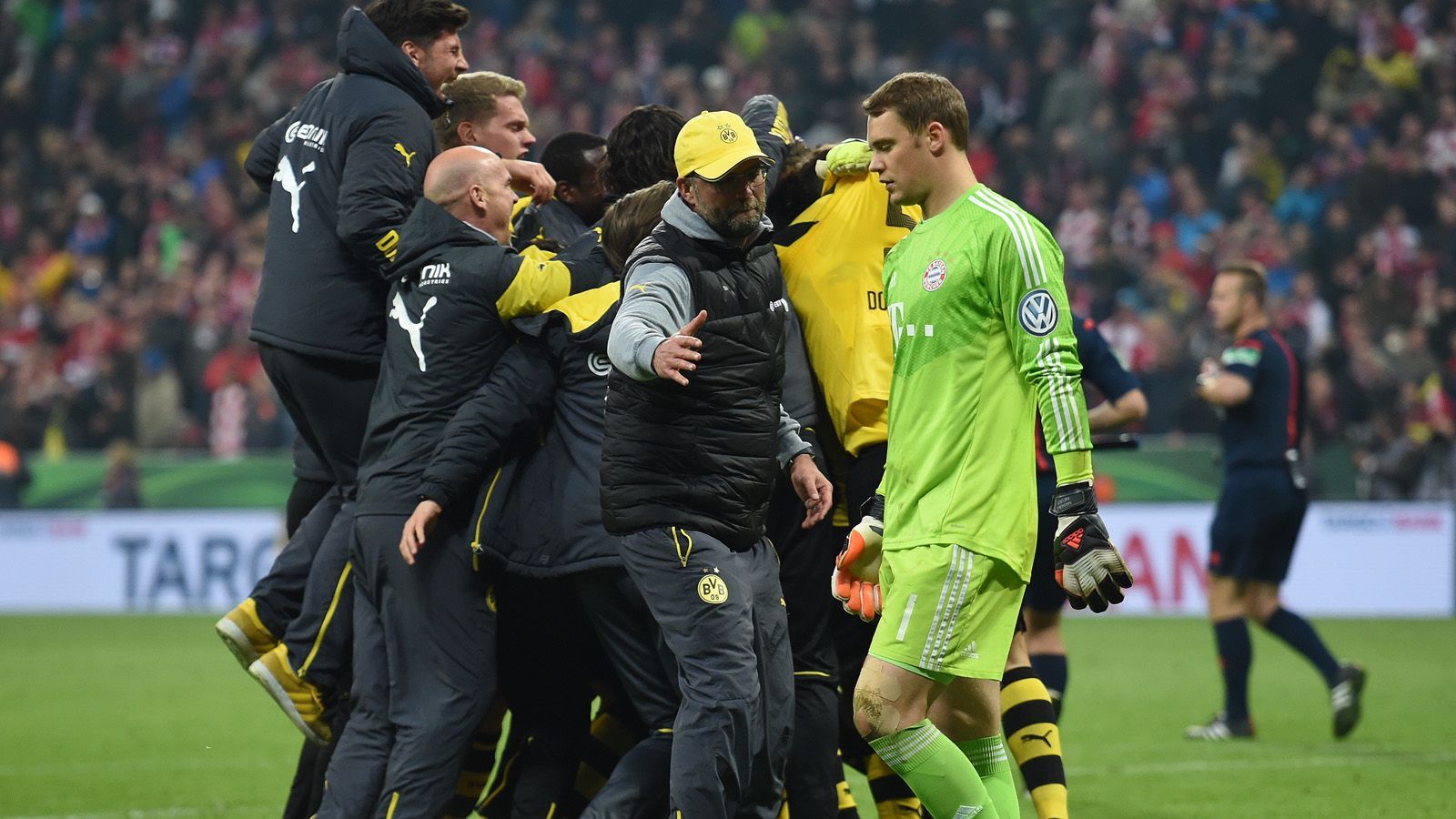 Drama im Elfmeterschießen: Alle Bayern-Akteure (Xabi Alonso, Philipp Lahm, Mario Götze und Manuel Neuer) verschießen. Die ersten beiden Schützen des Rekordpokalsiegers rutschen dabei nahezu identisch aus und jagen den Ball in den Münchner Nachthimmel. Der BVB zieht ins Finale ein.Imago