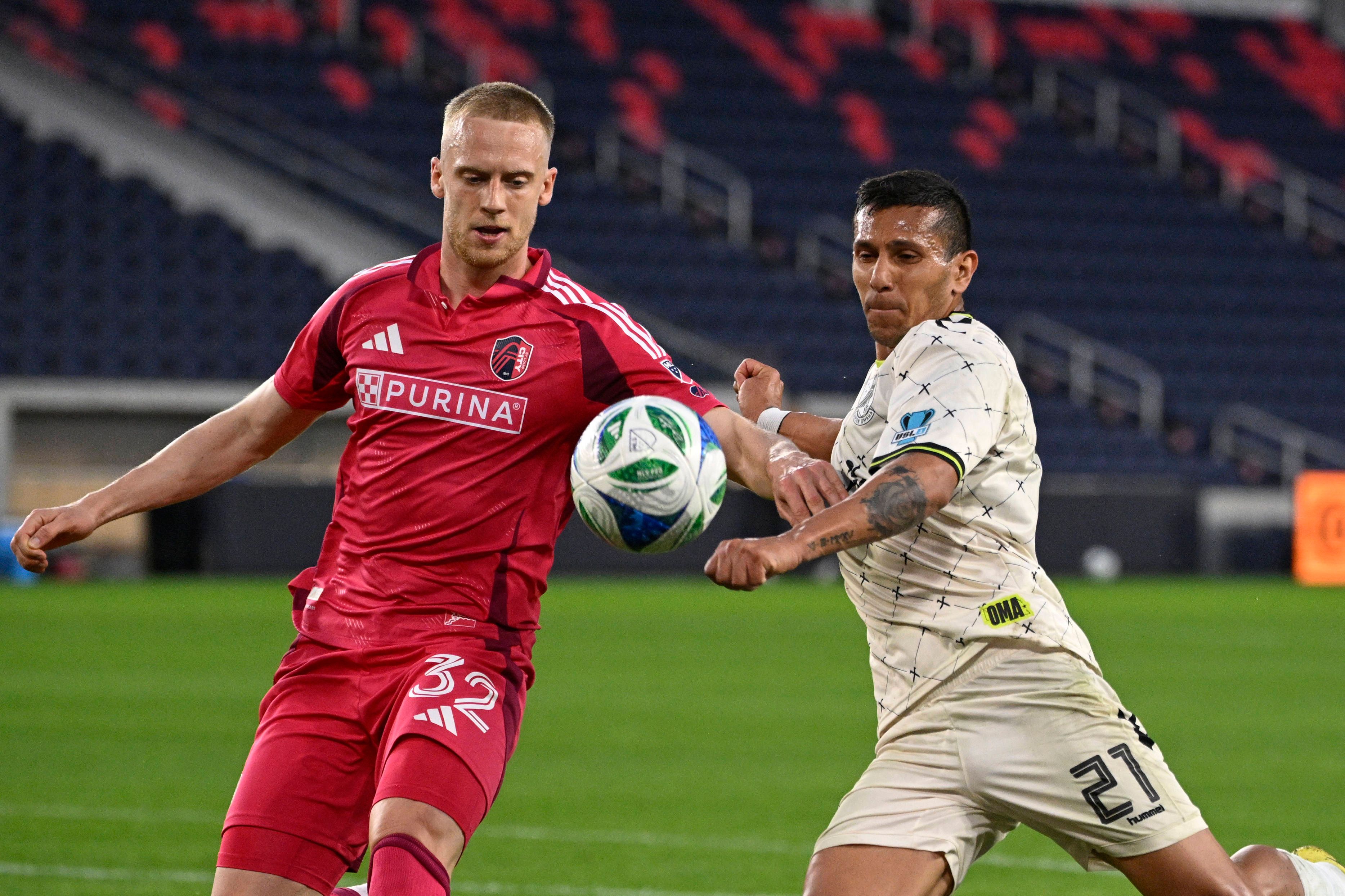 Soccer: US Open Cup-Round of 32-Union Omaha at St. Louis CITY FC May 7, 2025; St. Louis, Missouri, USA; St. Louis City defender Timo Baumgartl (32) and Union Omaha forward Aaron Gomez (21) battle f...