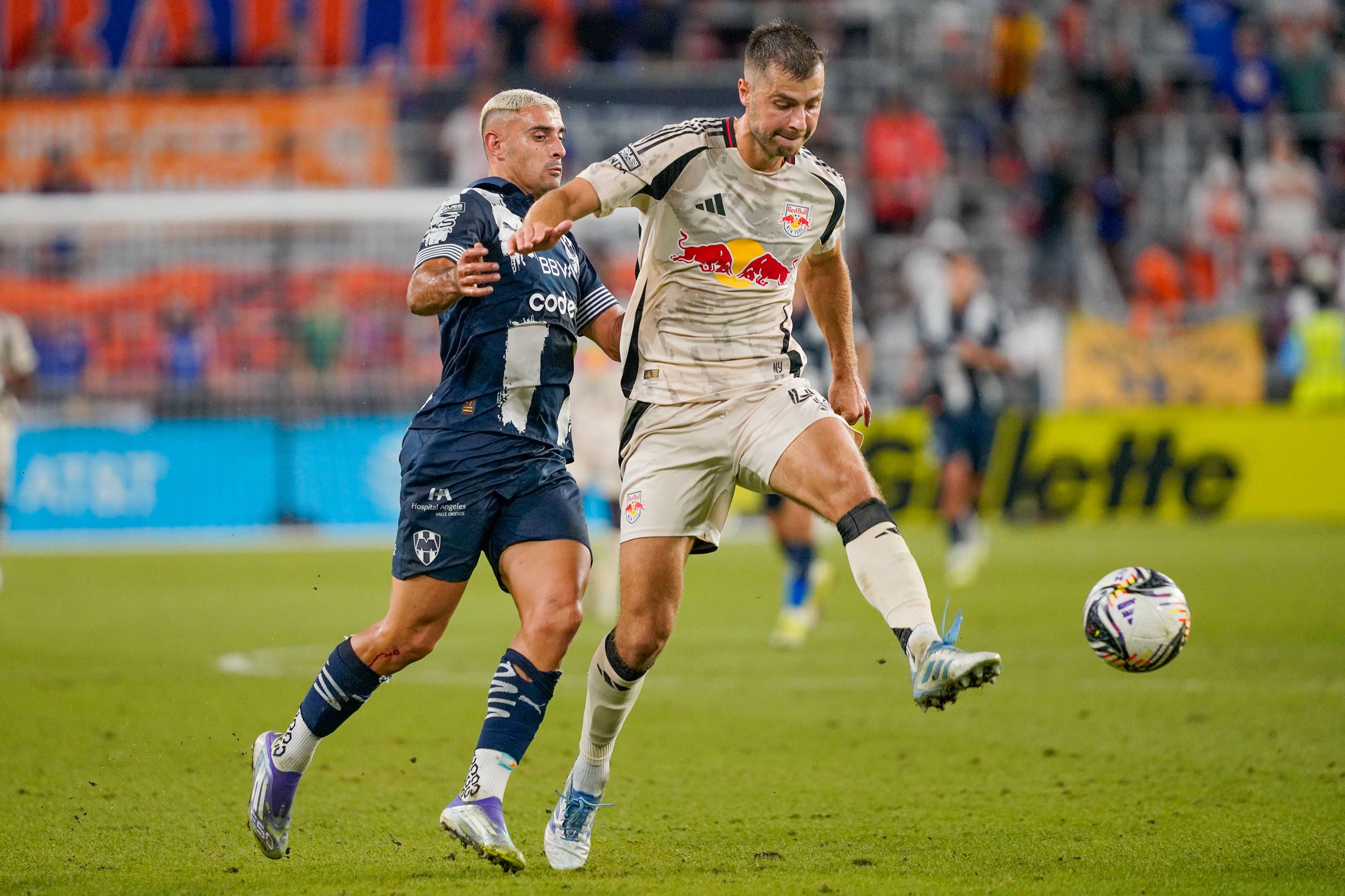 August 3, 2025, Cincinnati, Ohio, USA: New York Red Bulls defender Alexander Hack (42) clears the ball back to New York Red Bulls goalkeeper Carlos Coronel (31) to keep the ball away from Monterrey...