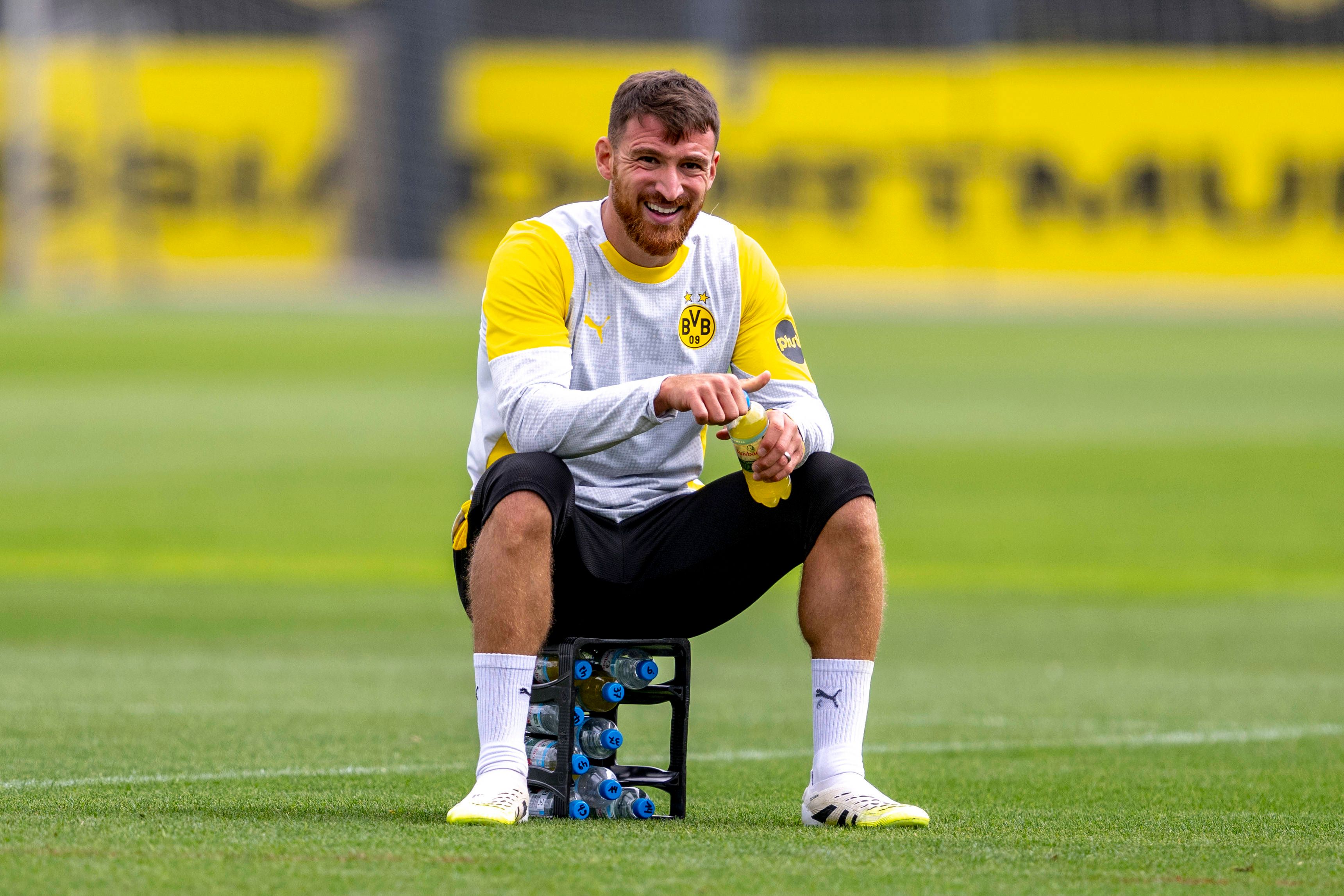 24.08.2025: Fußball:Öffentliches Training on Borussia Dortmund. Salih Özcan (Borussia Dortmund) sitzt auf einer Wasserkiste. *** 24 08 2025 Football Public training on Borussia Dortmund Salih Özcan...