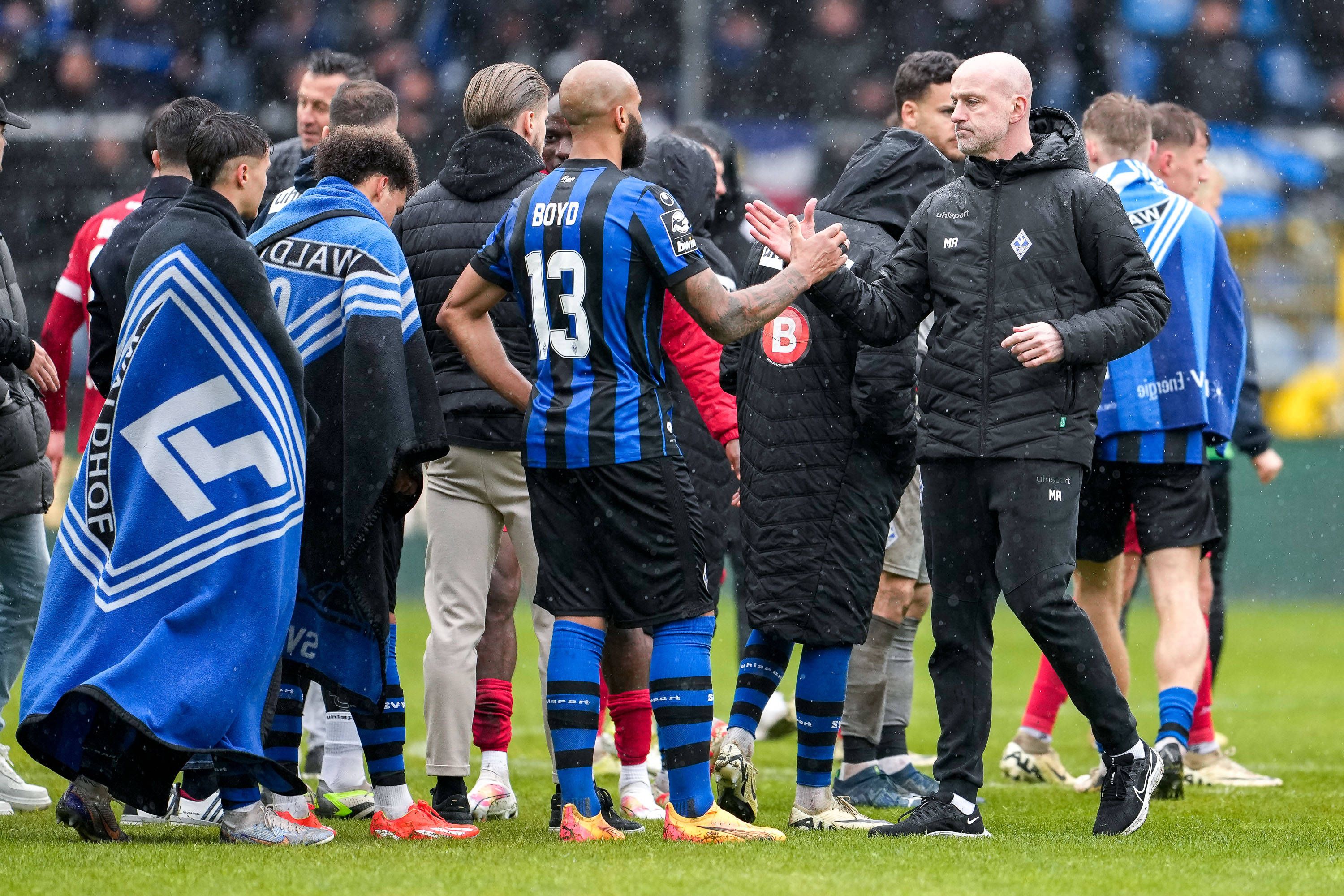 v.li.: Terrence Boyd (SVWM, 13) und Marco Antwerpen (Trainer, Cheftrainer, SVWM), Spieler vom SV Waldhof Mannheim (SVWM), enttäuscht über die Niederlage, Enttäuschung nach dem Schlusspfiff, Highlig...