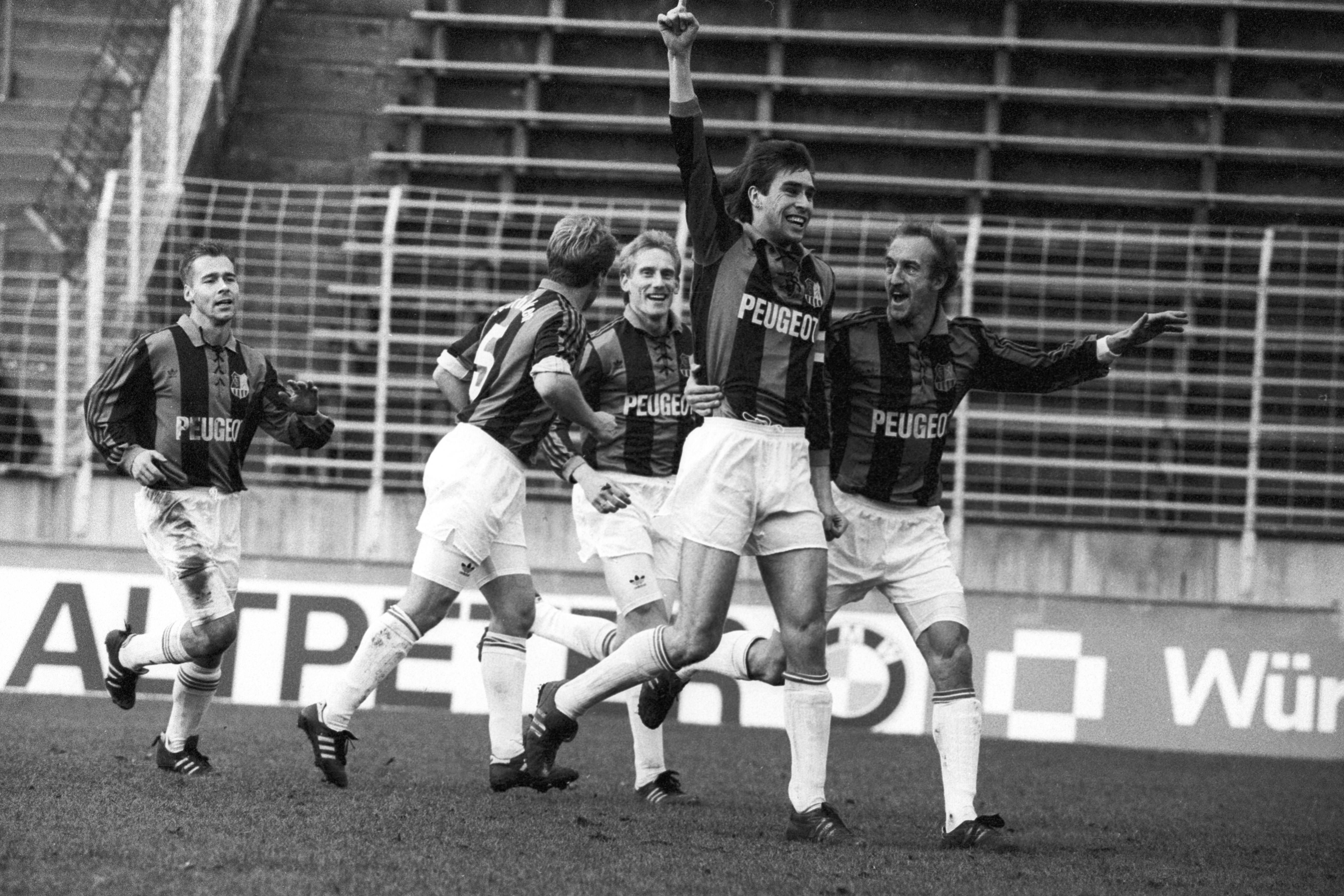 Jubel von Michael Preetz (2.v.re.), Michael Nushöhr (re.), Jürgen Lange (Mitte) und Christiaan Pförtner (li., alle 1. FC Saarbrücken)