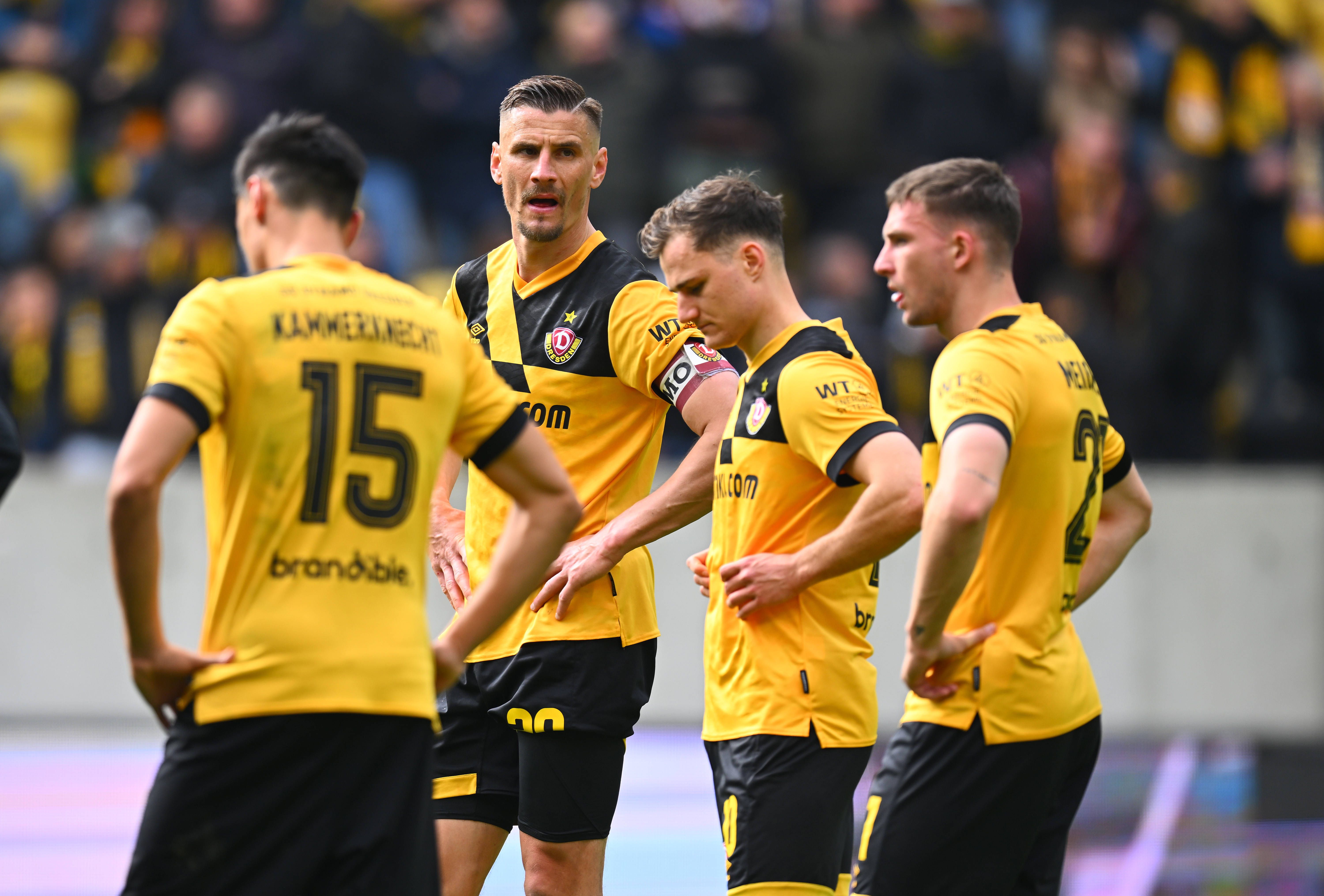 v.l.: Claudio Kammerknecht, Stefan Kutschke, Jakob Lemmer und Robin Meißner (alle Dresden), 20.04.2024, Fussball, GER, Saison 2023 2024, 3. Liga, Dritte Liga, 34. Spieltag, Rudolf-Harbig-Stadion Dr...