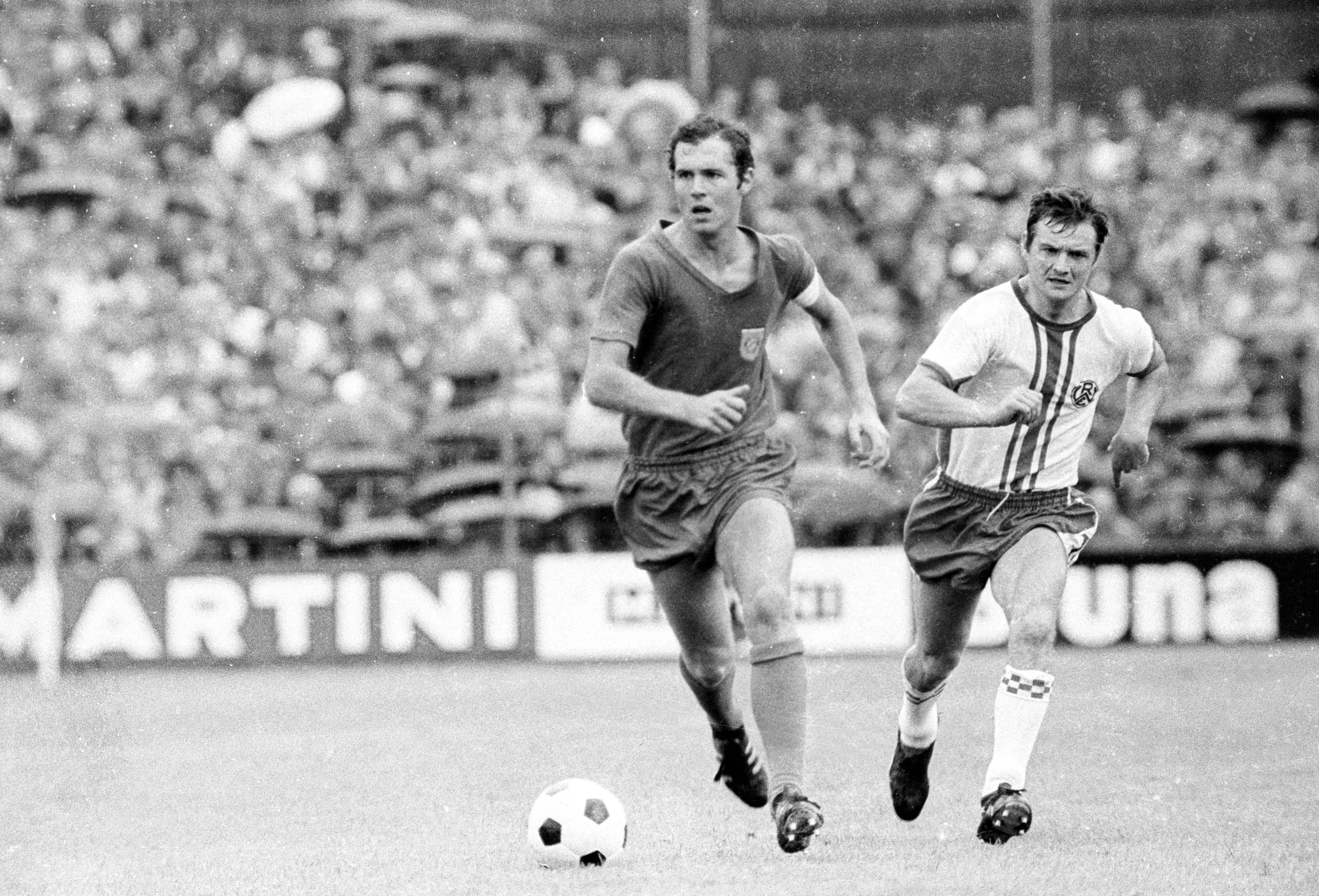 FC Bayern München - Rot Weiss Essen 4:0 - Franz Beckenbauer (Bayern, li.) gegen Willi Lippens (RWE)