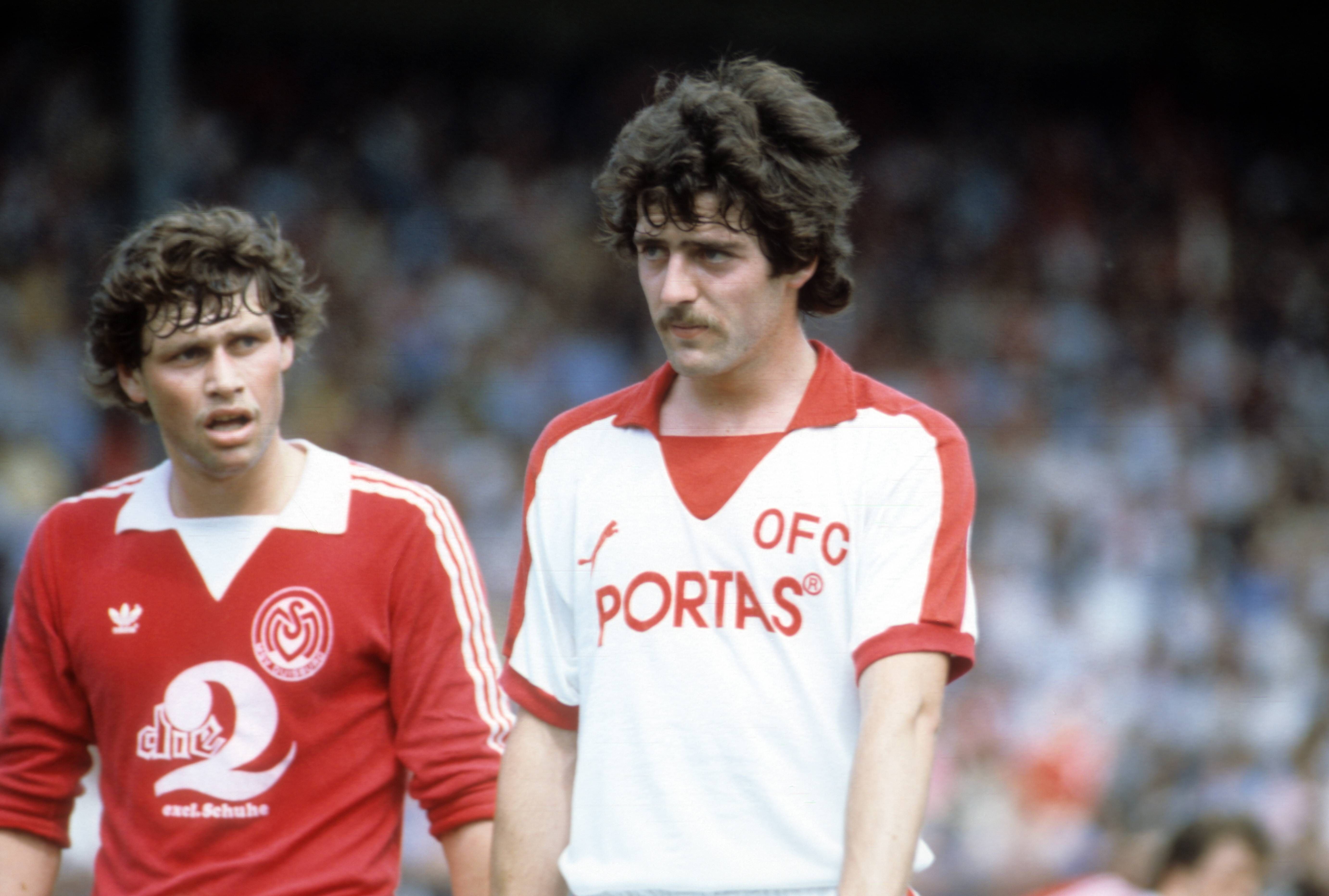 Uwe Bein (Offenbach, re.) und Udo Lay (Duisburg) - DEUTSCHSPRACHIGE SPORTZEITSCHRIFTEN UND -ZEITUNGEN NUR NACH RÜCKSPRACHE Fußball 2. BL Herren Saison 1982 1983, Offenbacher Kickers - MSV Duisburg ...