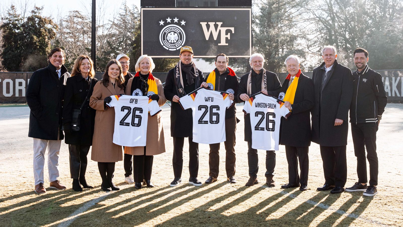 Zum Abschied des Vorabbesuchs der DFB-Delegation gab es noch ein gemeinsames Bild mit Vertretern der Wake Forest University und der Stadt Winston-Salem.Wake Forest Athletics