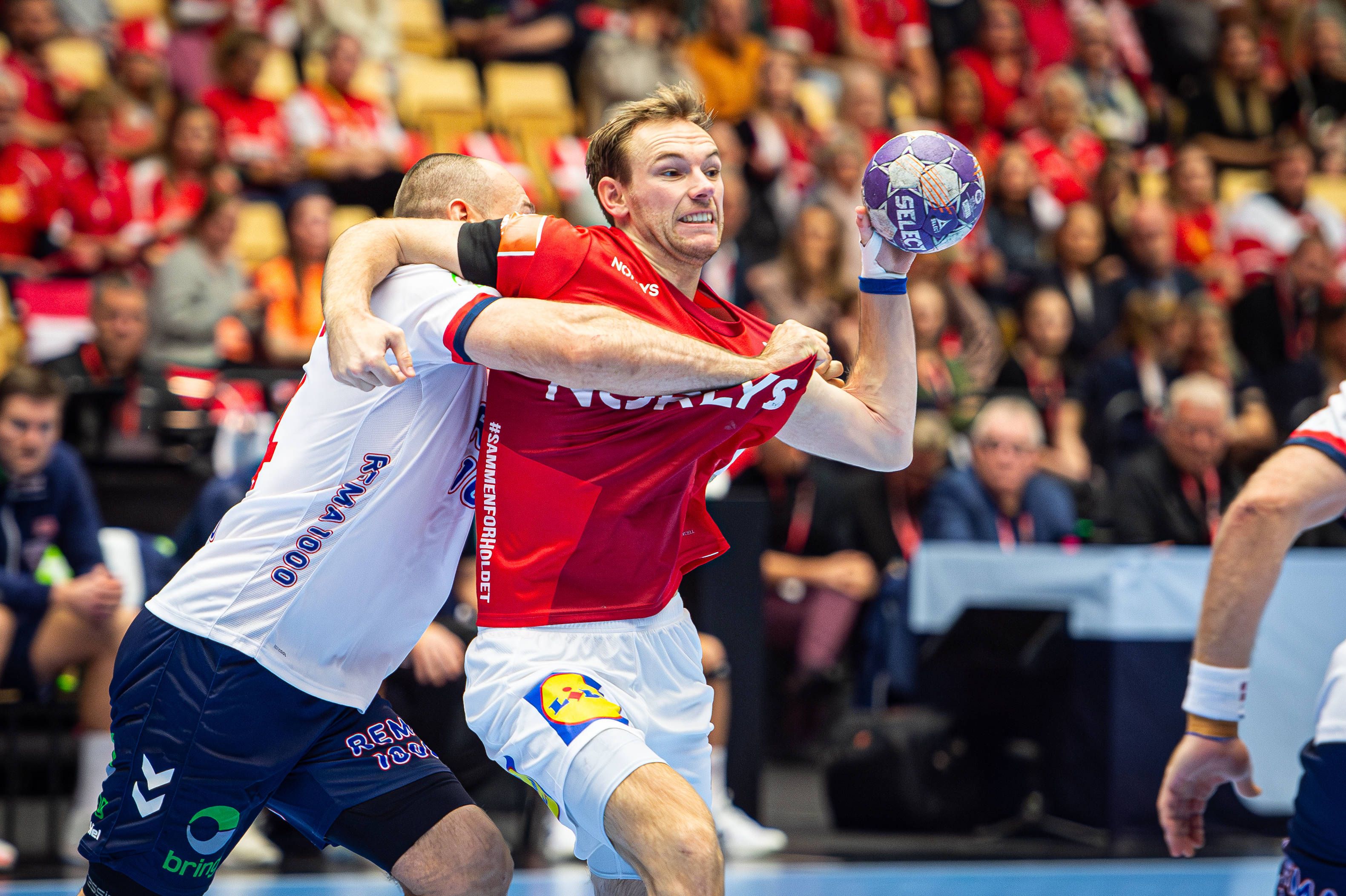 Denmark v Norway, EHF Euro Cup 2024, Herning, Denmark Herning, Denmark. 06th, November 2024. Mathias Gidsel (19) of Denmark and Christian O Sullivan (24) of Norway seen during the EHF Euro Cup 2024...