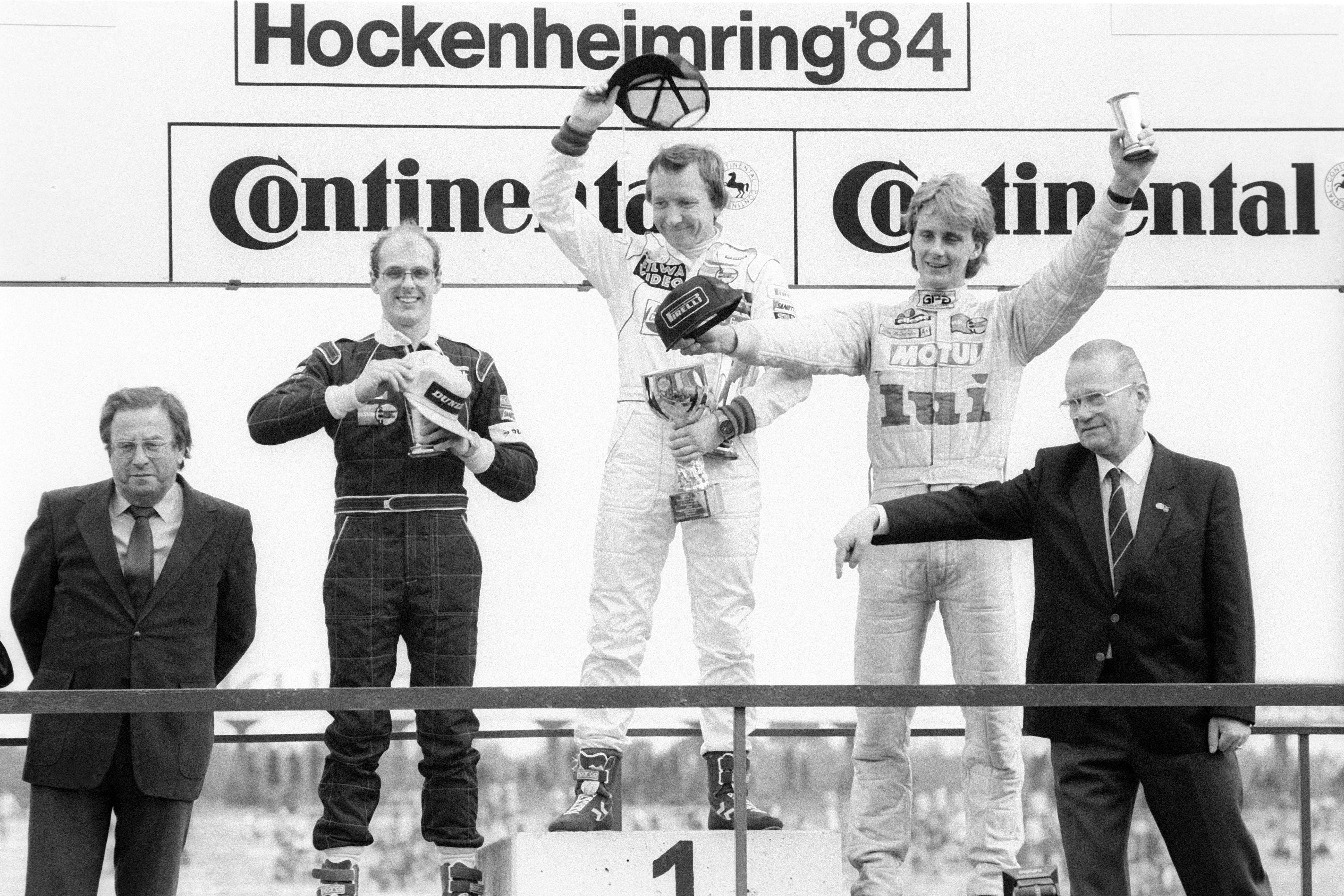 Siegerehrung DTM Hockenheim 1984: Sieger Harald Grohs (Mitte), Volker Strycek (li., beide BMW) und Peter Oberndorfer (alle Deutschland Alfa Romeo) o0 Siegerehrung Jubel, Freude Sieg, Sieger