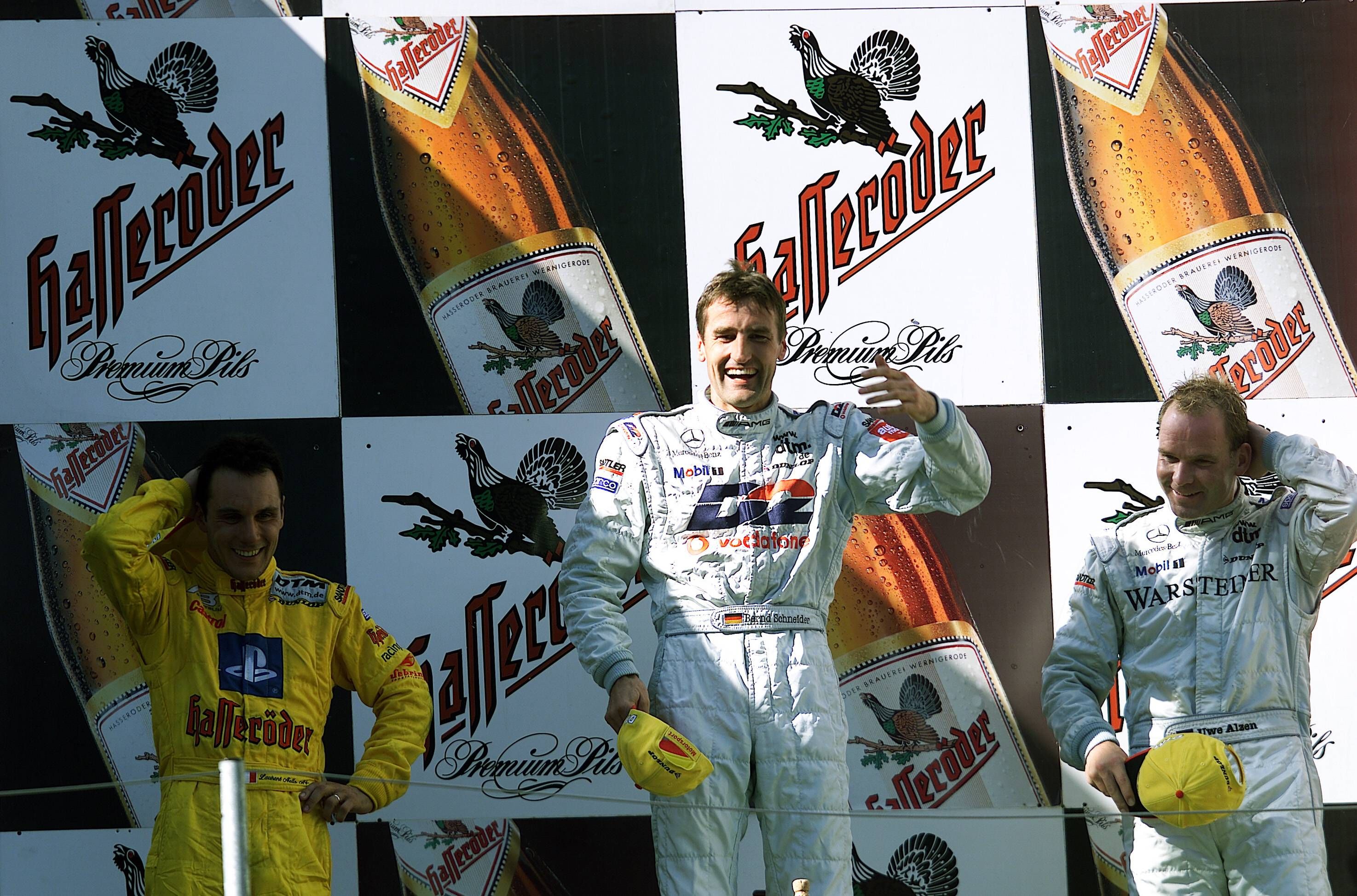 Siegerehrung A1 Ring 2001, v.li.: Laurent Aiello (Frankreich Audi), Sieger Bernd Schneider und Uwe Alzen (beide Deutschland beide Mercedes) Motorsport Herren Deutsche Tourenwagen Meisterschaft 2001...
