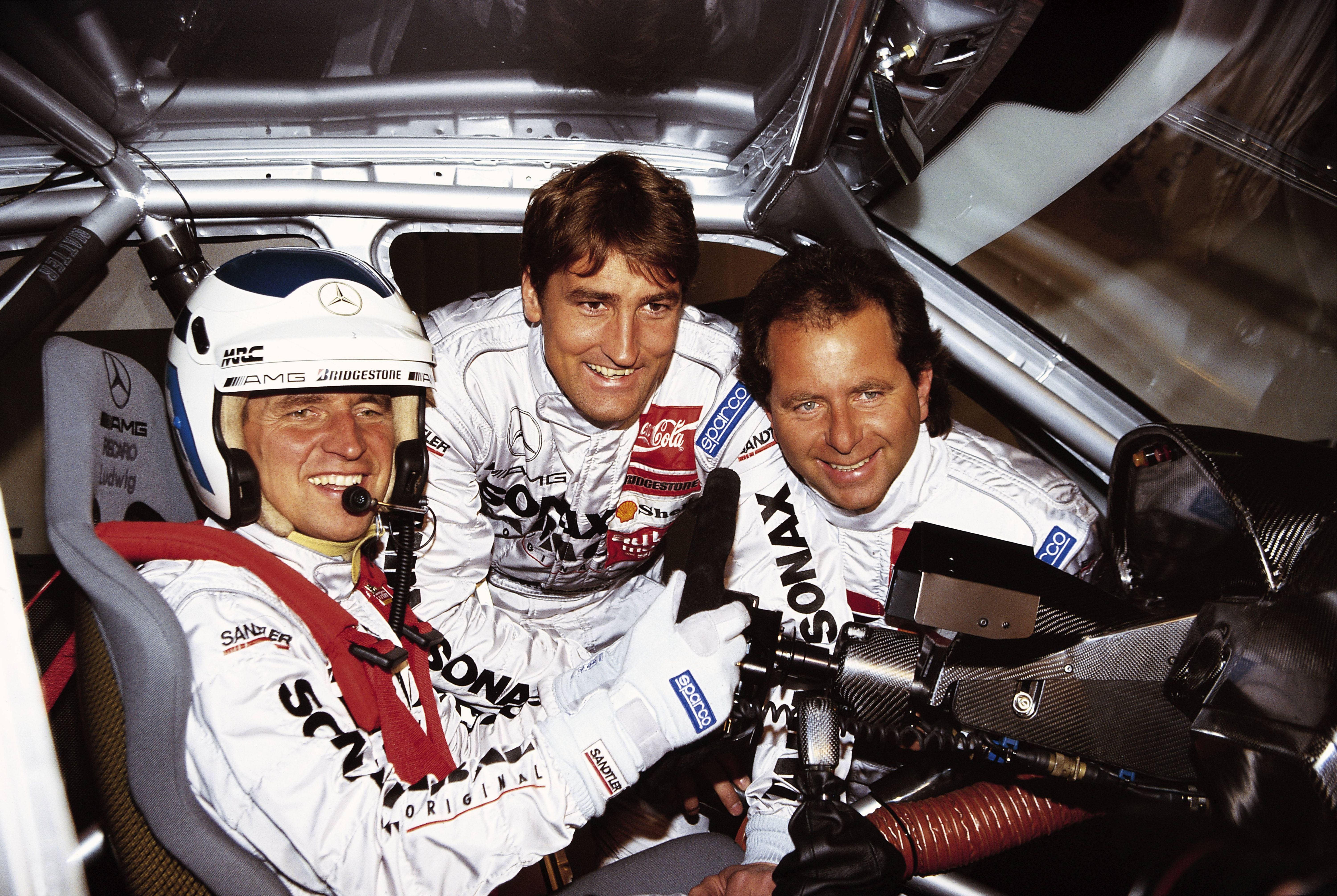 Gemeinsam im Cockpit, v.li.: Roland Asch, Bernd Schneider und Klaus Ludwig (alle Deutschland alle Mercedes) Motorsport Herren Deutsche Tourenwagen Meisterschaft 1994, DTM, Masters, Tourenwagenmeist...