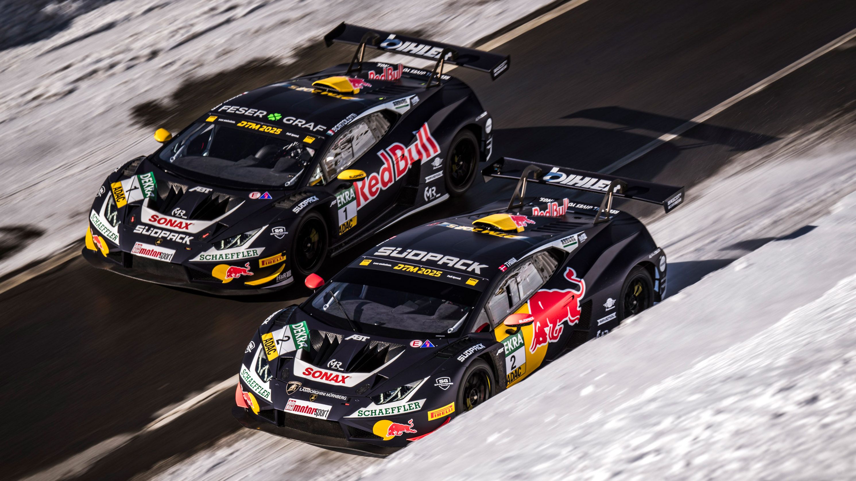 Für die "Äbte" beginnt 2025 eine neue Ära: Die erfolgreiche Partnerschaft mit Audi ist Geschichte, ab sofort setzen die Allgäuer auf den Lamborghini Huracan GT3 Evo2. Auch die Fahrerpaarung kann sich sehen lassen: Titelverteidiger Mirko Bortolotti (#1 und gelbe Außenspiegel) und Norisring-Sieger Nicki Thiim (#2 und rote Außenspiegel) geben sich die Ehre.Sebastian Marko / Limex Images