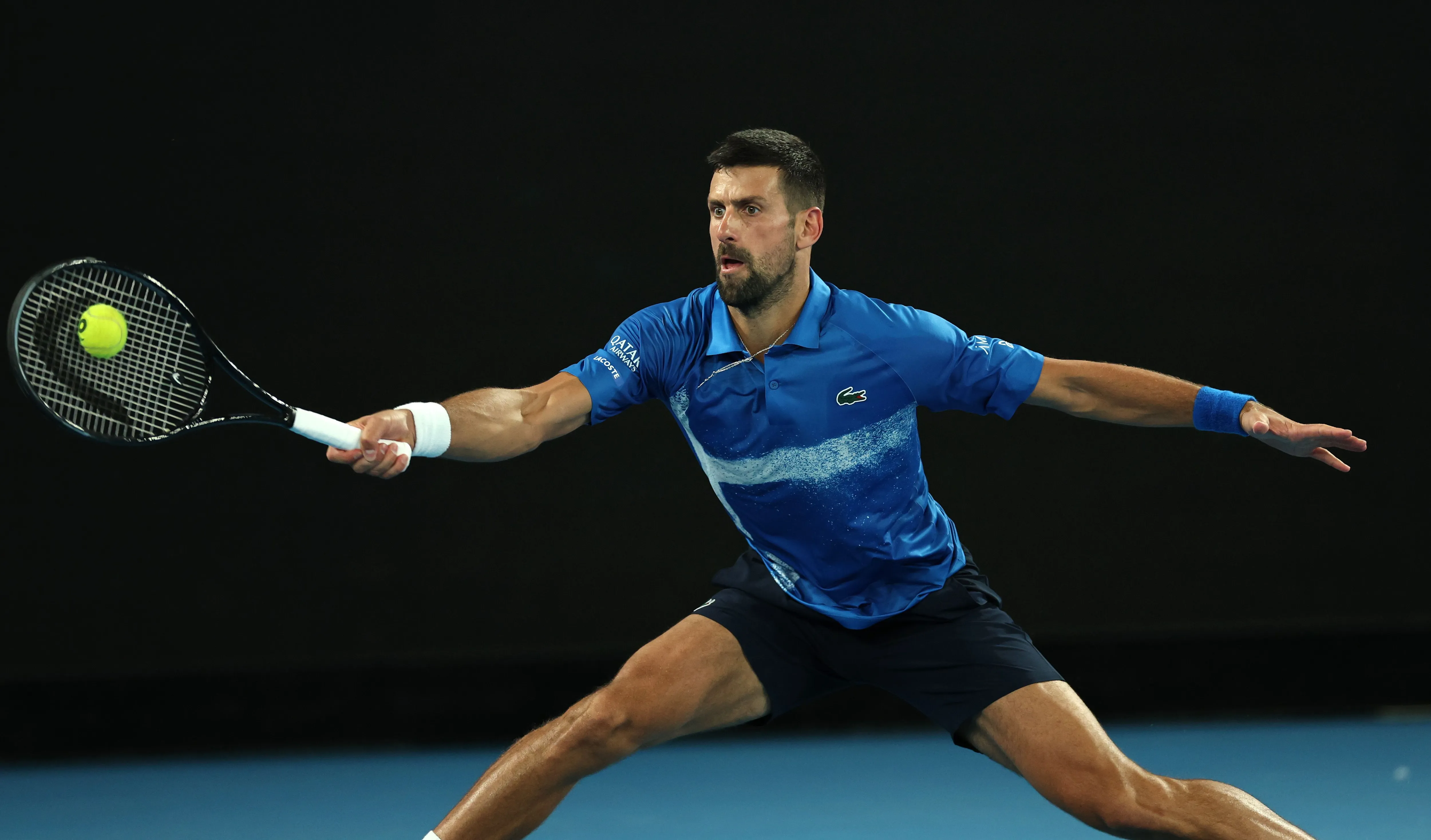 von ran.deMELBOURNE, AUSTRALIA - JANUARY 19: Novak Djokovic of Serbia plays a forehand against Jiri Lehecka of the Czech Republic in the Men's Singles Fourth Round match during day eight of the 2025 Australian Open at Melbourne Park on January 19, 2025 in Melbourne, Australia. (Photo by Cameron Spencer/Getty Images)